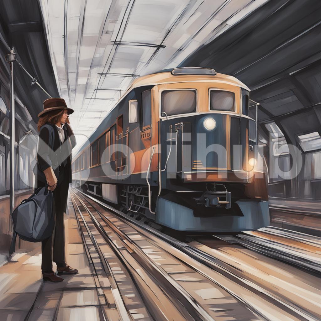 In the vivid painting, a sleek train streaks across the canvas, capturing the essence of motion with dynamic brushstrokes. Beside the tracks, a lady stands gracefully, her silhouette bathed in the train’s kinetic aura. The scene resonates with a sense of journey and contemplation, blending speed with stillness.