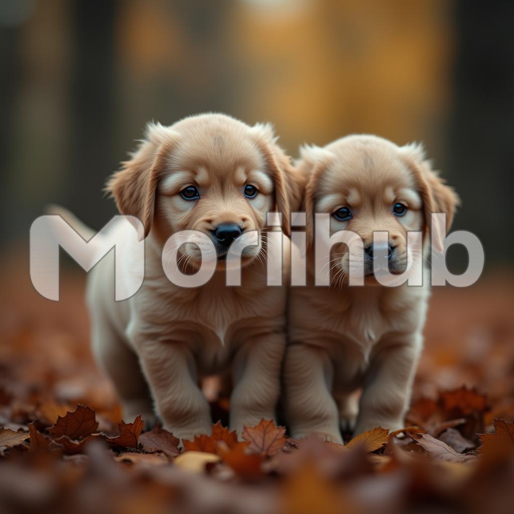 Puppies play in the crisp fall leaves, their fur blending with the vibrant autumn colors. They tumble and chase each other, surrounded by golden leaves and cool air, creating a heartwarming scene of joy and energy.