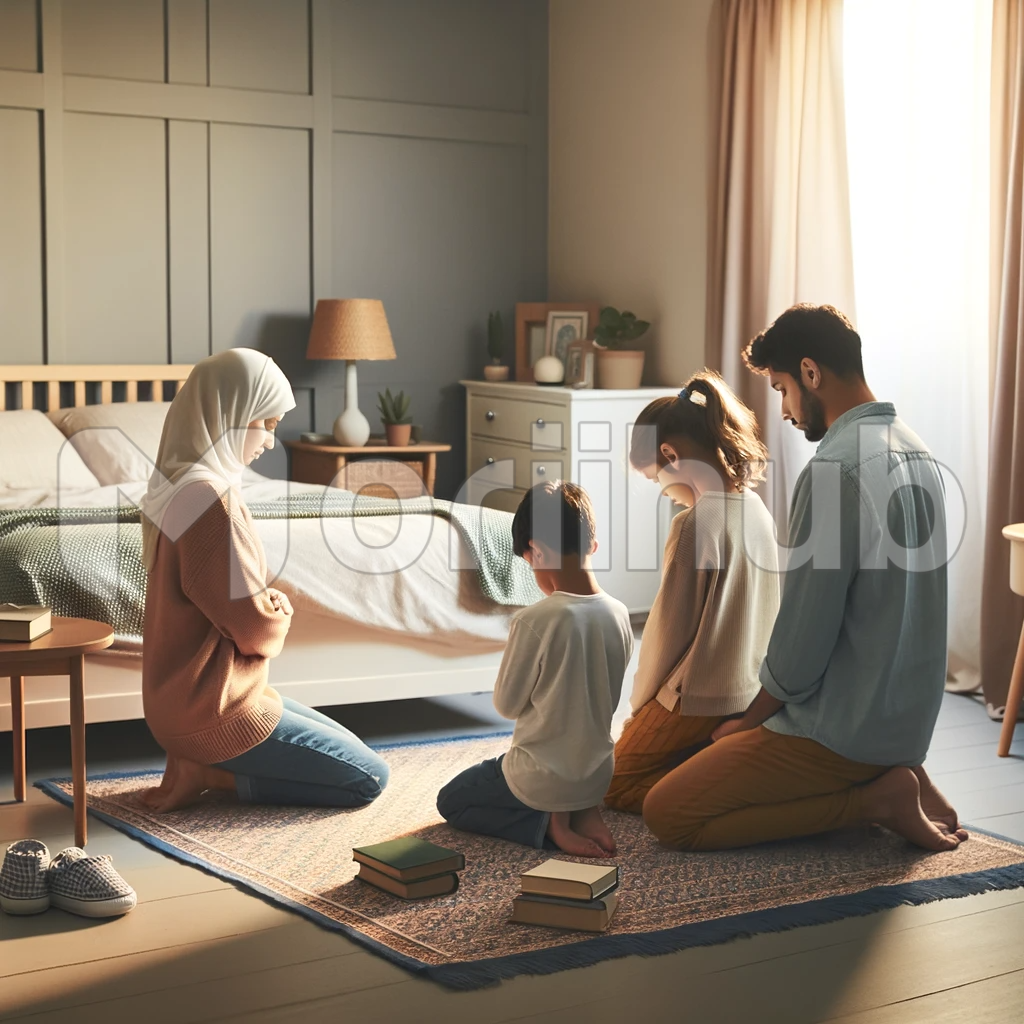 In their intimate bedroom, a family of four unites in a solemn and reverent moment of prayer. Two adults and two children join hands, their eyes closed in devotion. The room exudes a peaceful aura, with soft, warm lighting casting gentle glows upon their faces, creating a tranquil and harmonious atmosphere of faith and togetherness.