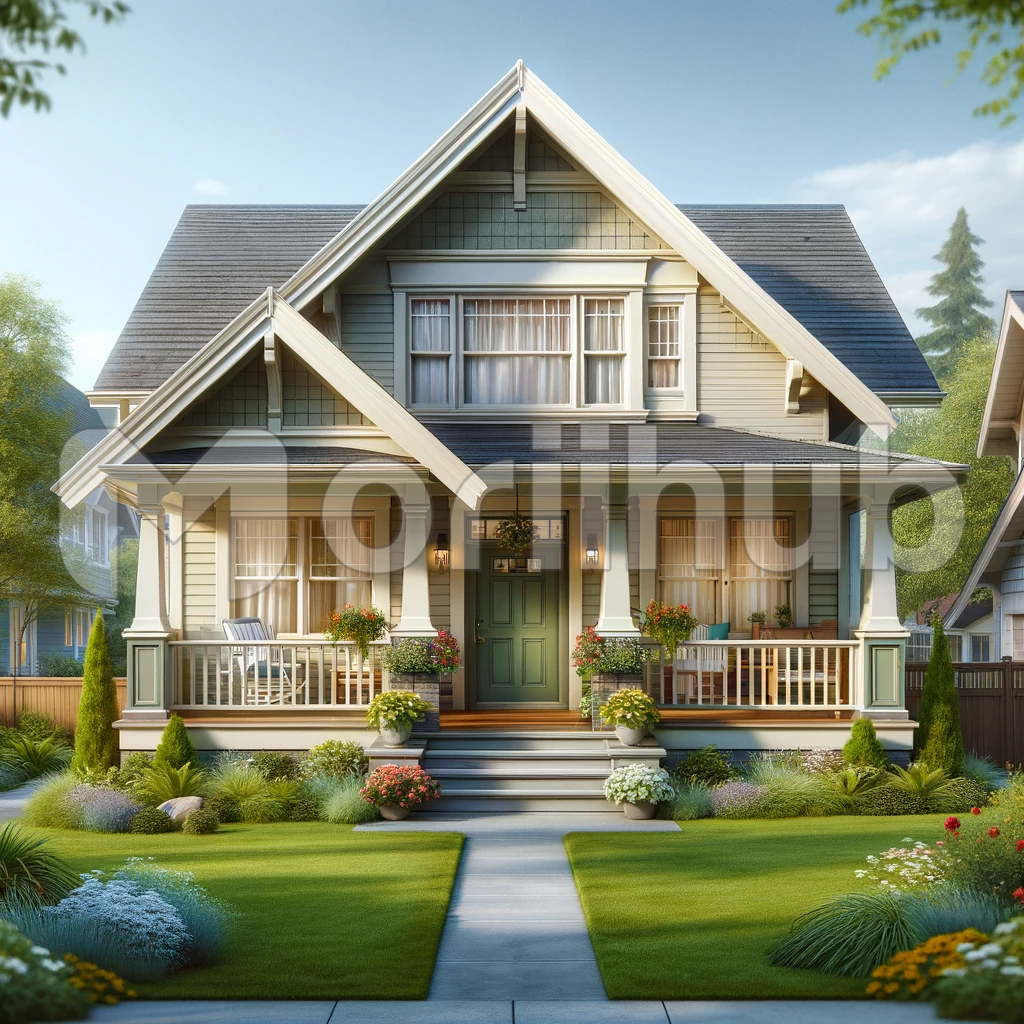 This charming and welcoming family home exudes timeless elegance with its classic design. Its front view features a pitched roof and an inviting front porch, perfect for gathering. The exterior walls are adorned with a warm, earthy-toned siding, exuding a sense of comfort and coziness that beckons all who approach to come in and feel at home.