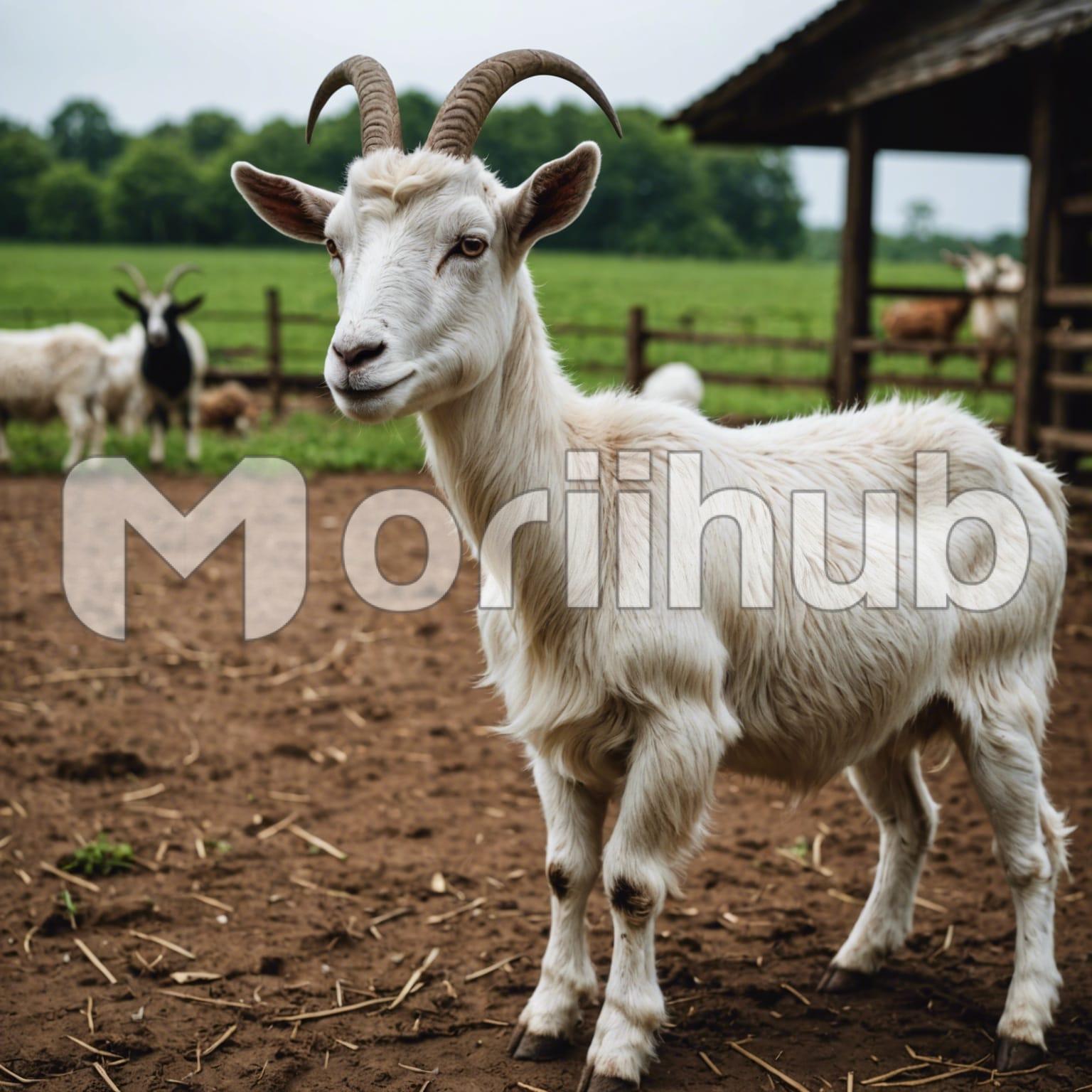 In a serene farm scene, a goat stands poised, gazing ahead with attentive eyes. Its fur gleams under the gentle sunlight. Behind it, two goats are engrossed in playful activity, their movements lively against the backdrop of rustic wooden fences and lush greenery. The atmosphere exudes a sense of harmony and vitality, capturing the essence of farm life. Each goat’s distinct presence adds to the charm of the scene, reflecting their natural curiosity and lively interactions in their peaceful rural surroundings.