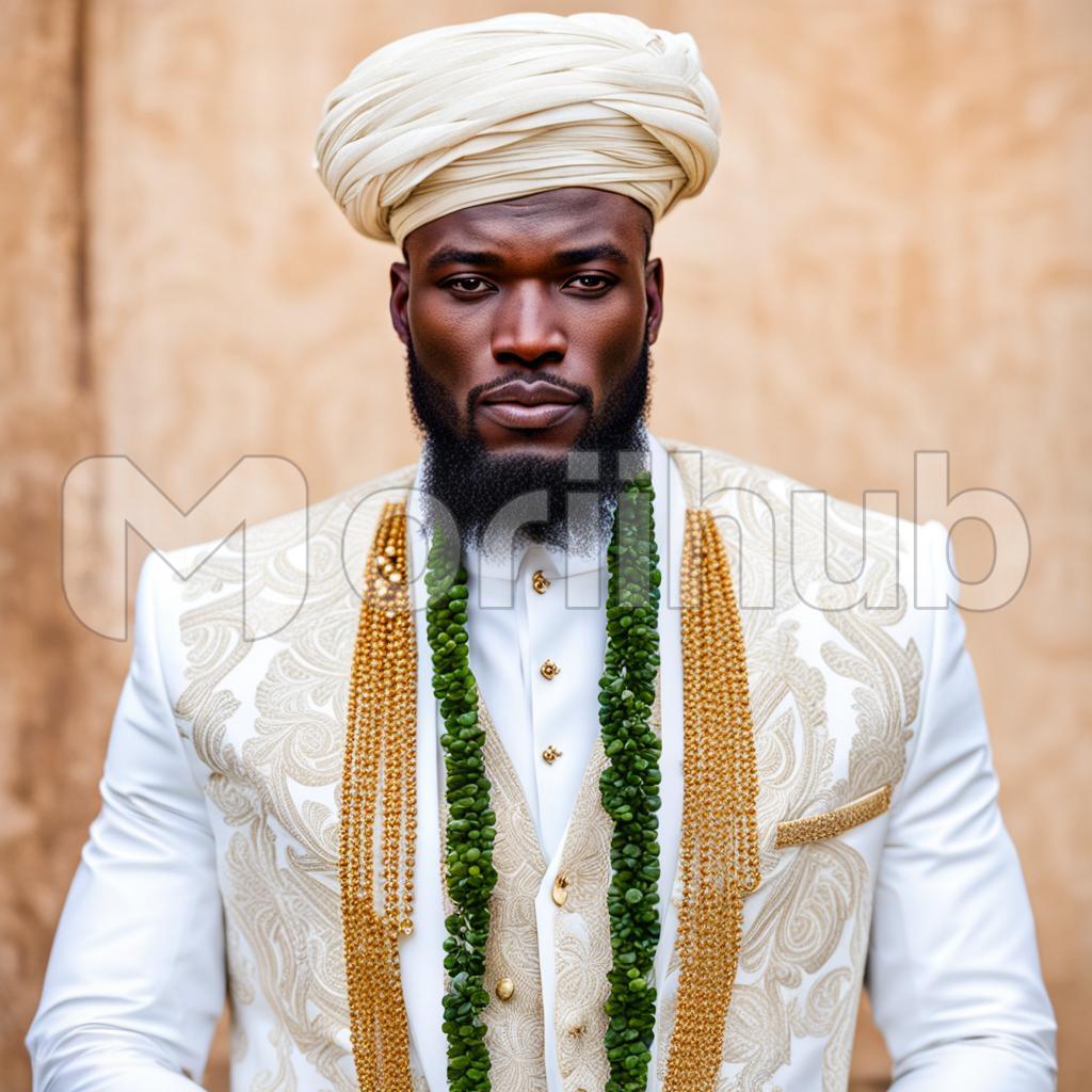An African male model exudes regal elegance, donning a vibrant headtie that complements his chiseled features. The rich fabric gracefully wraps around his head, a symbol of cultural pride and sophistication. His confident stance reflects the fusion of tradition and modernity, creating a striking portrayal of African heritage in the world of fashion.