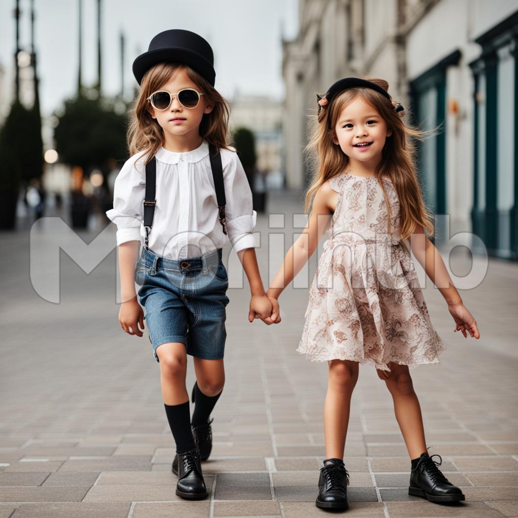Two young fashion enthusiasts, barely reaching the height of grown-up dreams, confidently stroll down the street in miniature versions of chic attire. Their poses mimic the runway’s grace, each step a declaration of youthful style. The sidewalk transforms into their own catwalk, a whimsical dance of innocence and fashion flair, where every smile becomes a fashionable accessory.
