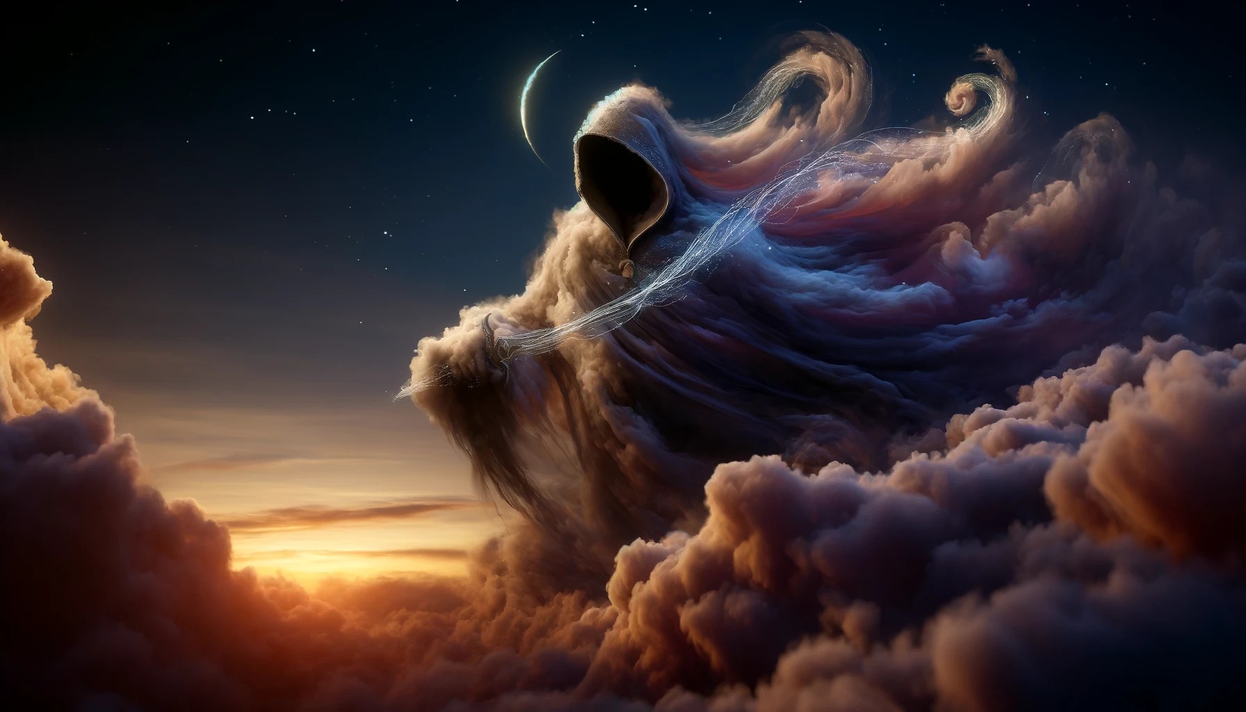 The image depicts a breathtaking, surreal cloud formation shaped like a mysterious assassin. The assassin’s figure is defined by flowing, smoky tendrils forming a hooded silhouette, with shadowy features obscuring their face. The cloak billows dramatically in mid-motion, as if caught in a gust of celestial wind. A curved dagger, made from denser, darker clouds, is clutched in the figure’s hand, adding an air of danger.