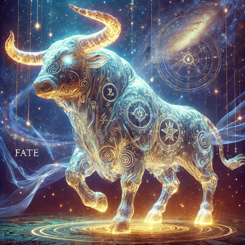 The image presents a majestic crystal bull infused with the fate element, standing with immense power in an ethereal, cosmic landscape. Its body is sculpted from translucent, glowing crystal, shimmering with shifting cosmic symbols and ancient celestial runes that pulse with destiny’s energy. The bull’s piercing eyes radiate an ancient, mystical glow, while its massive horns, appearing to be carved from pure starlight, illuminate the surroundings with divine brilliance.