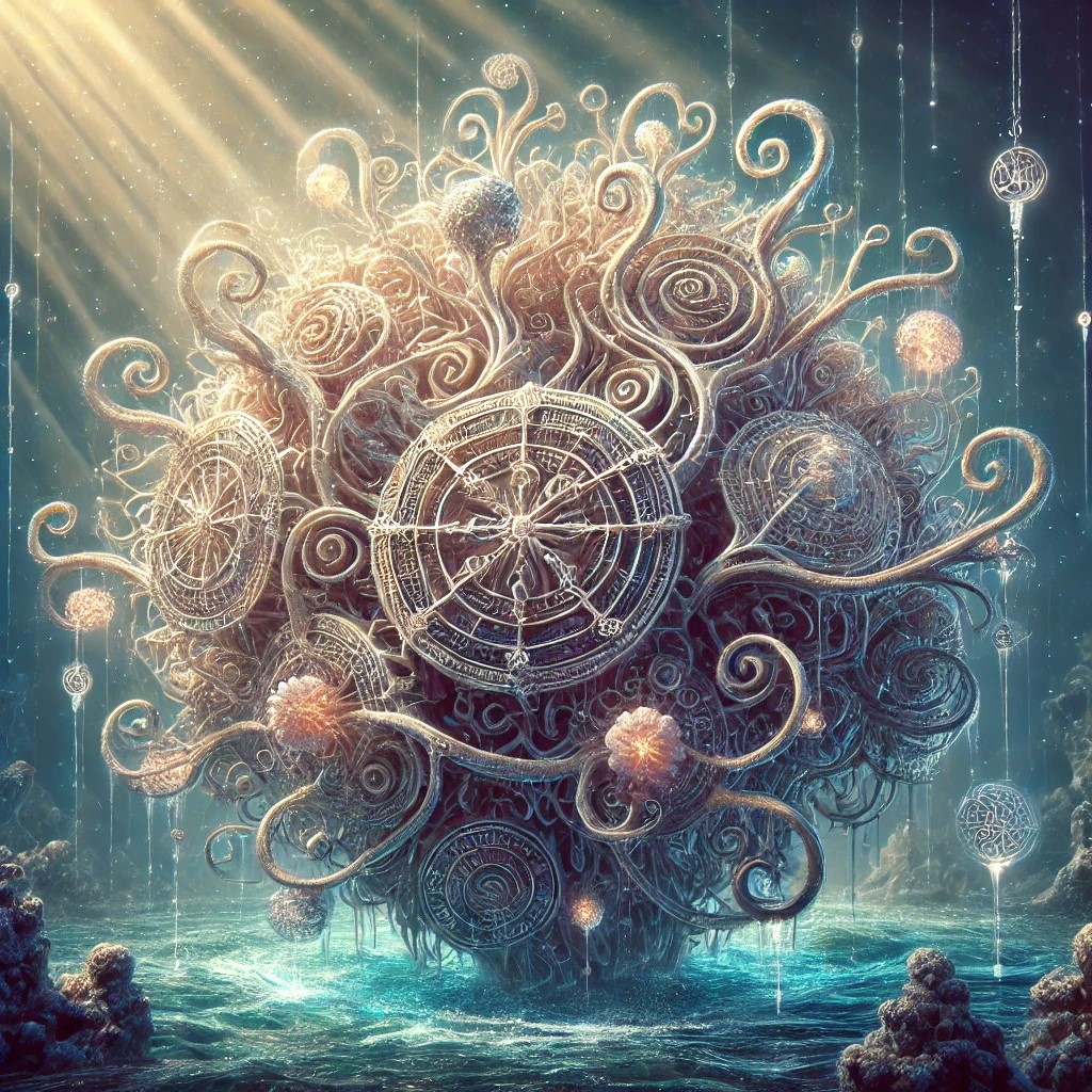 Fate coral growing in a mystical, ethereal part of the ocean, where the currents of destiny seem to converge. The coral is intricately woven, with delicate branches that twist and spiral like the threads of fate itself. Each branch is adorned with patterns resembling ancient symbols, runes, and labyrinths, as if they map out the many possible paths of destiny. The coral glows with a soft, shimmering light, shifting through hues of silver, gold, and deep indigo, reflecting the ever-changing nature of fate.