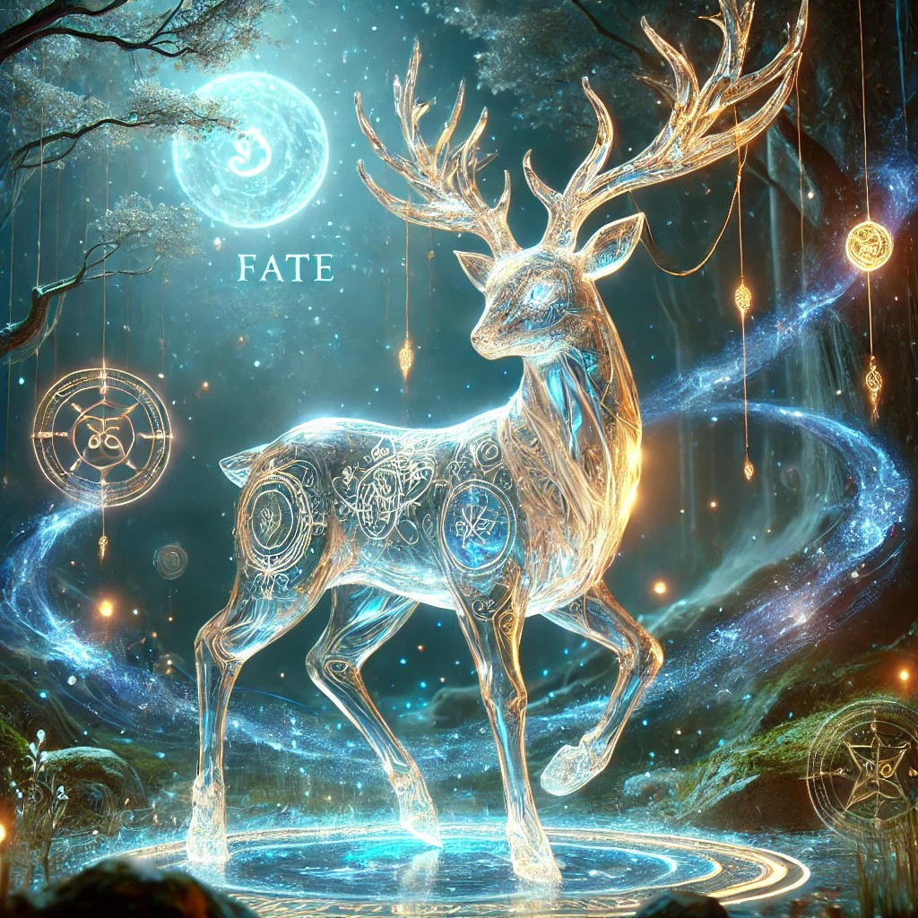 The image showcases a majestic crystal deer infused with the fate element, standing elegantly in an ethereal, dreamlike forest. Its body is sculpted from translucent, radiant crystal, with shifting celestial constellations and glowing ancient runes etched into its surface. The deer’s eyes gleam with an otherworldly wisdom, reflecting the mysteries of destiny. Its grand antlers shimmer with delicate strands of golden light, weaving intricate threads of fate that flow gently through the air.