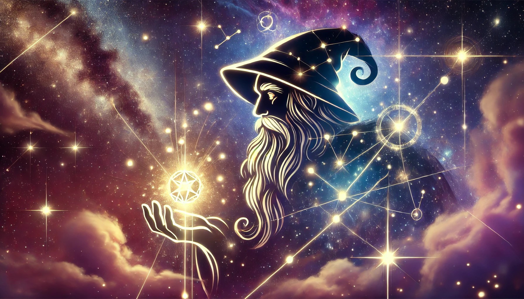 This image depicts a stunning cosmic scene with a constellation in the shape of a dwarf, outlined by radiant stars connected by delicate glowing lines. The dwarf is shown holding an artifact that symbolizes the element of fate, which radiates a mystical golden and white light.