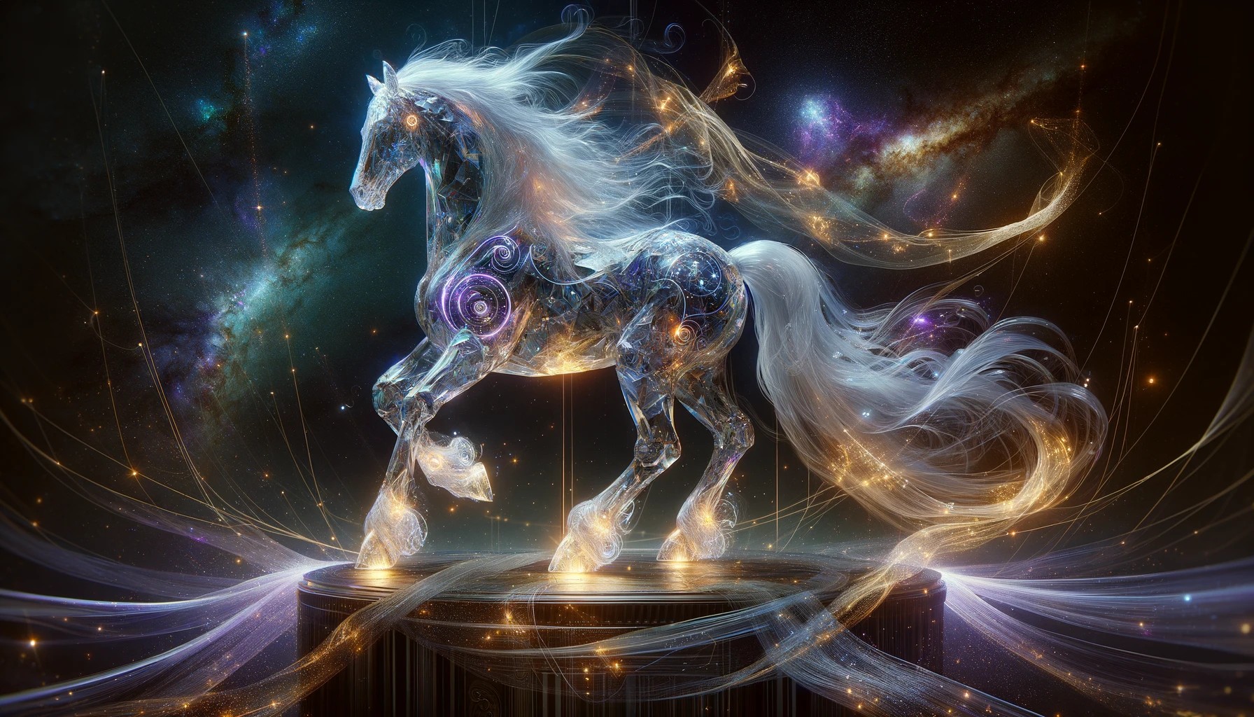 A majestic horse sculpted entirely from translucent, glowing crystal, infused with the essence of fate.