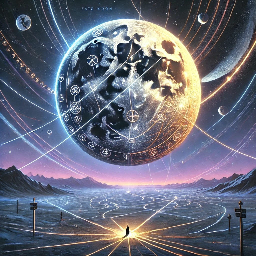 In a twilight sky, the “Fate Moon” glows softly, shifting between silver, gold, and deep blue. Its surface is inscribed with ancient, glowing runes and symbols of destiny, which continuously rearrange themselves. From the moon, threads of light stretch out, connecting to the landscape below. These threads of fate weave across a vast terrain of crossroads, mountains, and valleys.