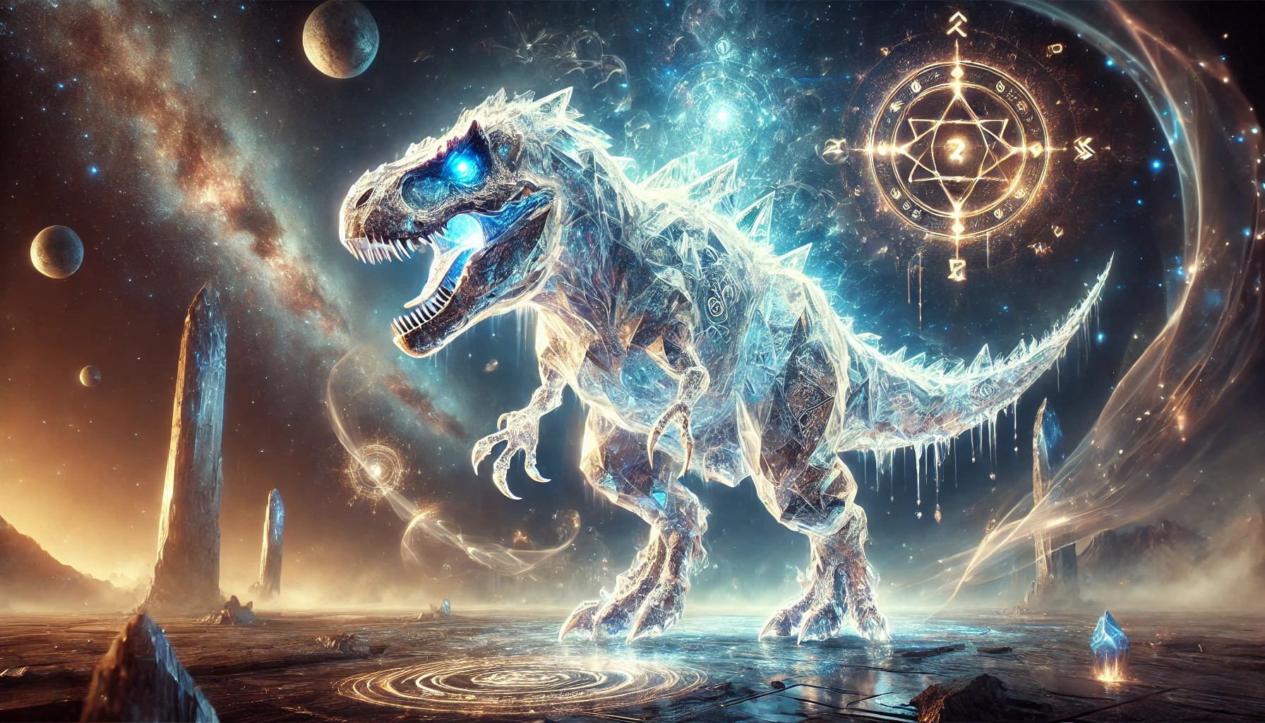 This breathtaking artwork features a colossal Crystal T-Rex, infused with the very essence of fate, standing majestically in a cosmic, otherworldly realm. Its body is composed of sharp, translucent crystal shards, refracting light into mesmerizing colors. Embedded within its crystalline structure are ancient glowing runes, symbols of destiny and cosmic power that pulse with ethereal energy.