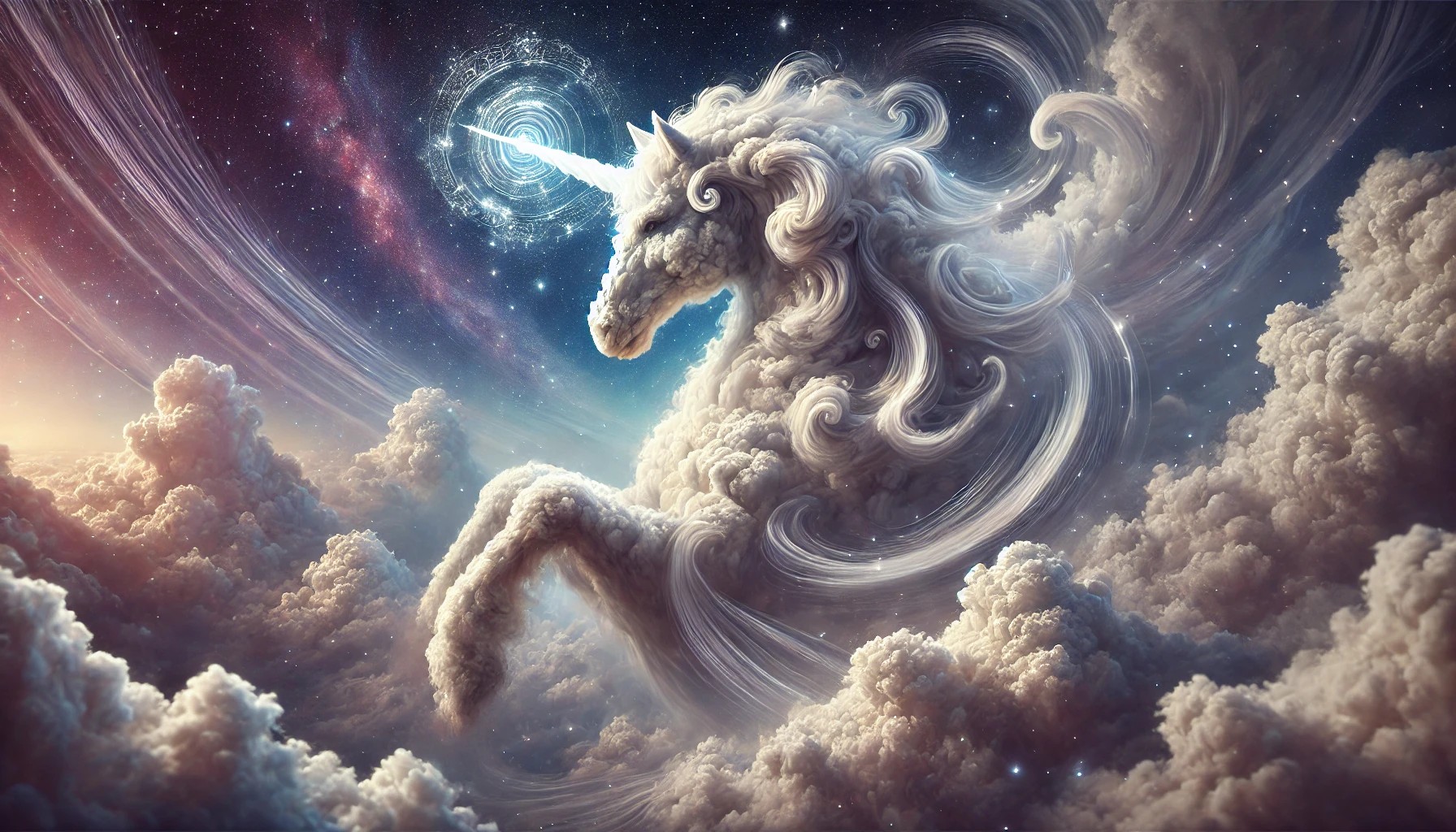 The image showcases a breathtaking celestial scene of a unicorn-shaped cloud gracefully floating in the night sky. The unicorn’s body is made of soft, billowing clouds, giving it a dreamlike and ethereal presence. Its mane and tail appear wispy, blending seamlessly with the surrounding sky.