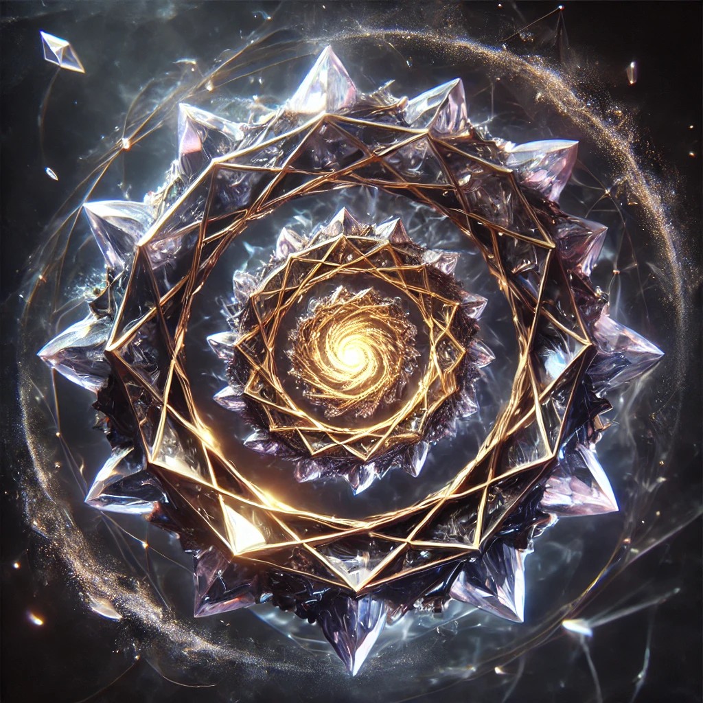 The image features a mesmerizing crystal vortex, spiraling upwards in an intricate, angular design that glows faintly with an otherworldly light. The crystal itself is a deep, shifting mix of gold, silver, and dark purple, representing the intertwined threads of fate. At the core of the vortex, a faint ethereal light emanates, drawing attention to its center. Surrounding the spiral, shimmering threads of energy twist and weave, symbolizing the forces of destiny. The air around the vortex crackles with a sense of foreboding and inevitability, giving the impression that the vortex controls time and fate itself.