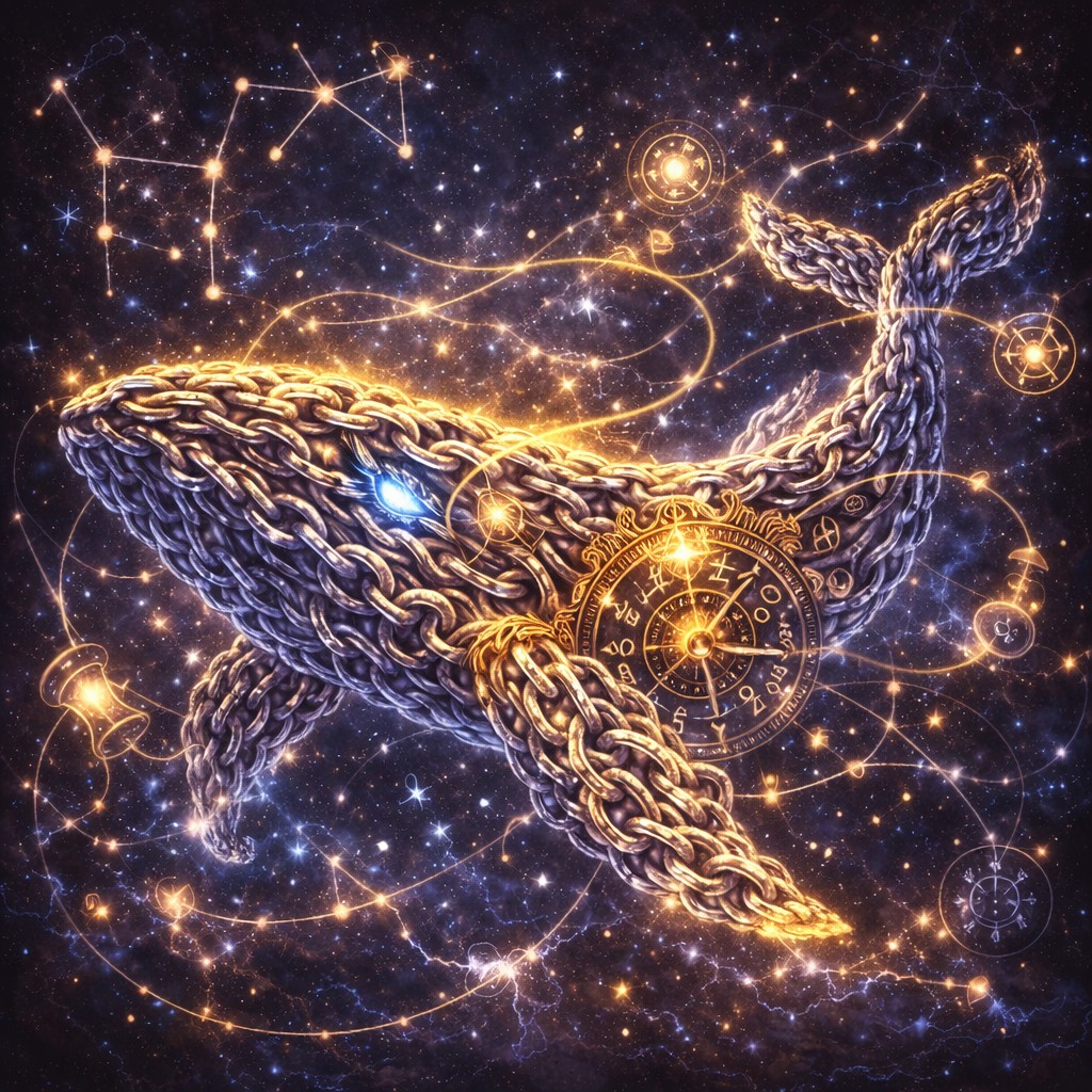 A colossal whale made of interlocking silver chains swims through a sea of stars, its body curving gracefully amid constellations that burn like distant lanterns. Each chain link glints with a soft, cosmic glow, and along its flank a great golden astrolabe is fused into the metal, its rings and runes turning slowly as if measuring destinies instead of time. A single blue-white eye shines from the whale’s head, calm and knowing, while thin strands of golden light trail from its body, weaving between hourglasses, zodiac symbols, and tiny orbiting clocks.