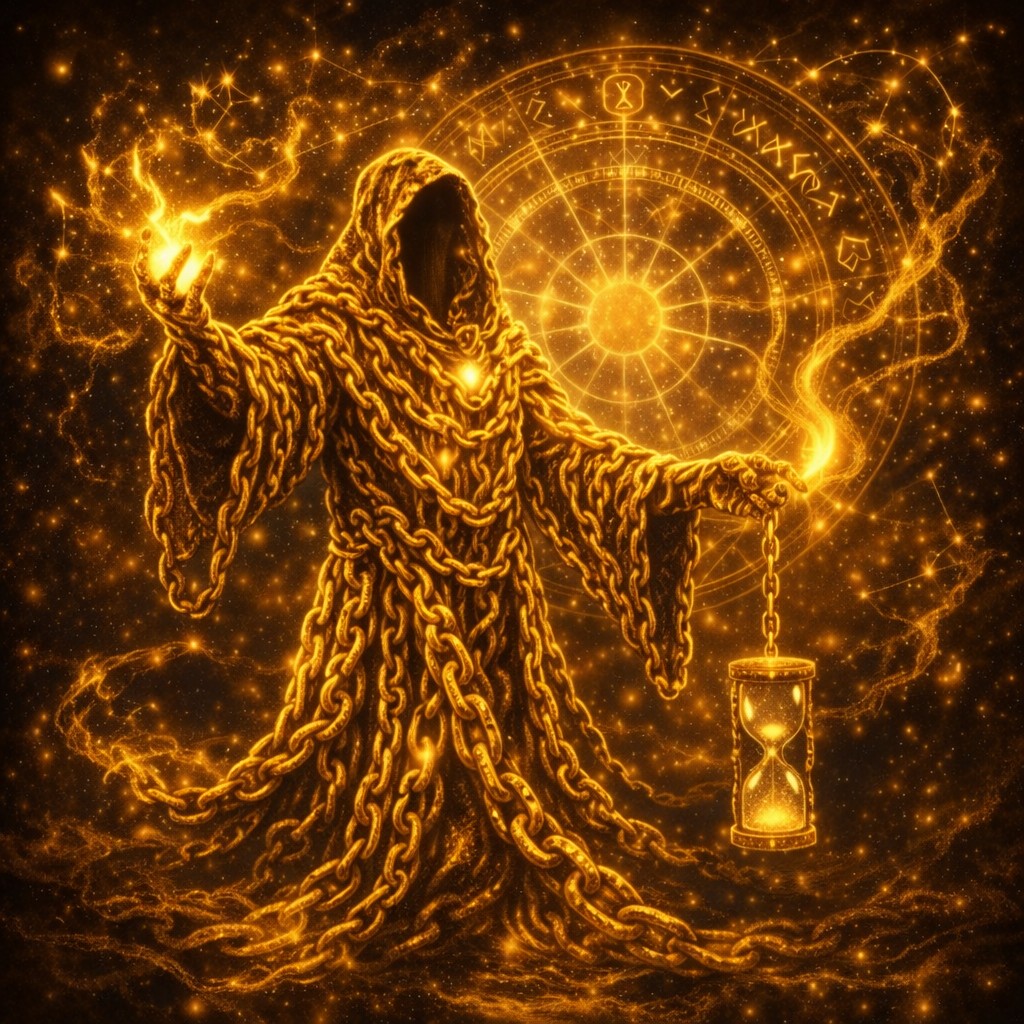 A towering wizard made of interlocking golden chains rises from a swirling nebula of stardust, his flowing robe and hood entirely woven from molten-looking links. His face is an empty shadow beneath the hood, but a warm golden light glows from within, hinting at hidden power. One chained arm is raised, releasing a flare of shimmering energy that curls into glowing trails across the starry darkness.