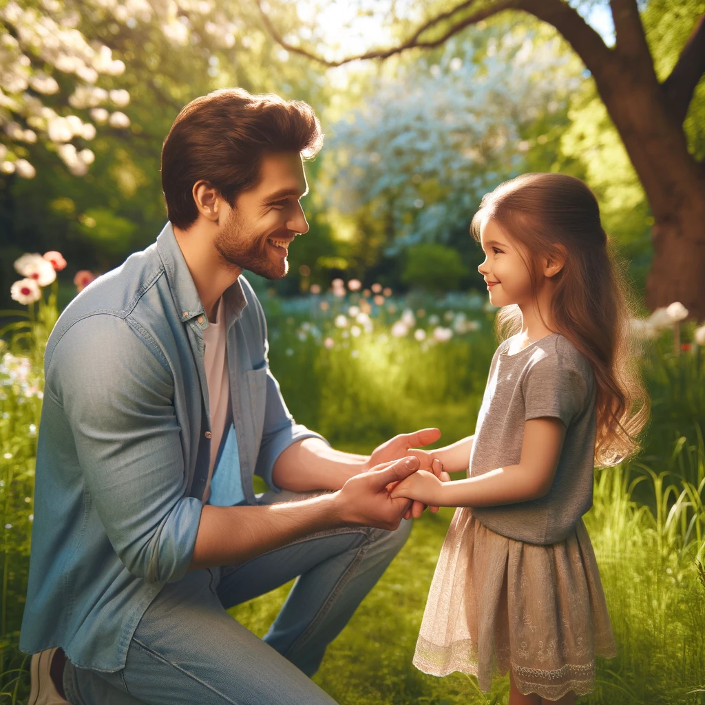 In a heartwarming scene, a father kneels down, meeting his daughter’s gaze with a tender smile. His arms envelop her in a warm embrace, radiating love and protection. Their eyes meet, sparkling with shared affection and understanding, capturing a moment of pure connection and unbreakable bond.