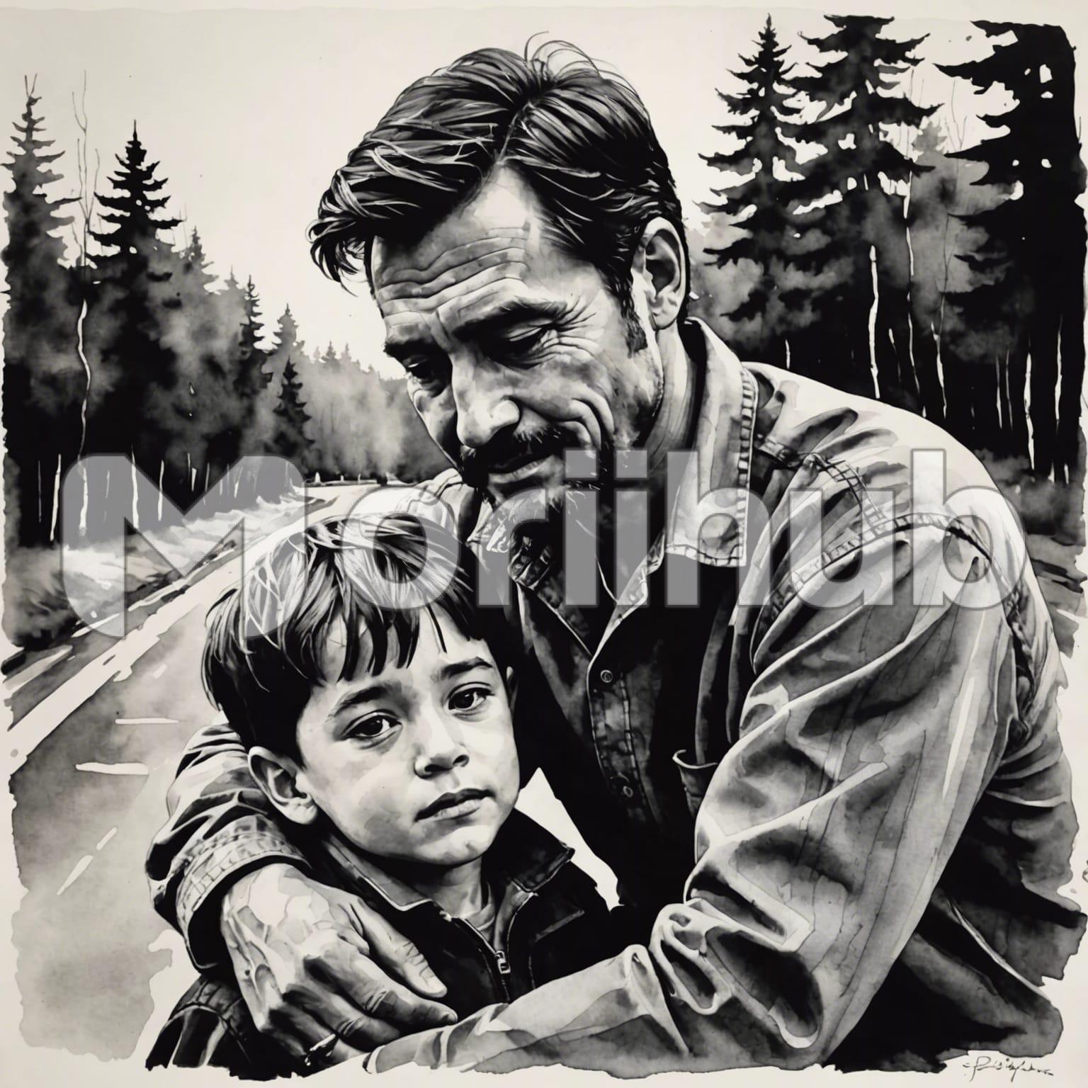 In the strokes of ink, a poignant scene unfolds: a father cradling his son within the confines of the painting’s frame. With tender care, he envelops the child in an embrace that transcends the boundaries of the canvas. Each brushstroke captures the depth of their bond, weaving a tale of paternal love and protection. Against the monochrome backdrop, their connection radiates with warmth and intimacy, a timeless portrayal of the unbreakable bond between father and son, immortalized in the delicate lines of ink.