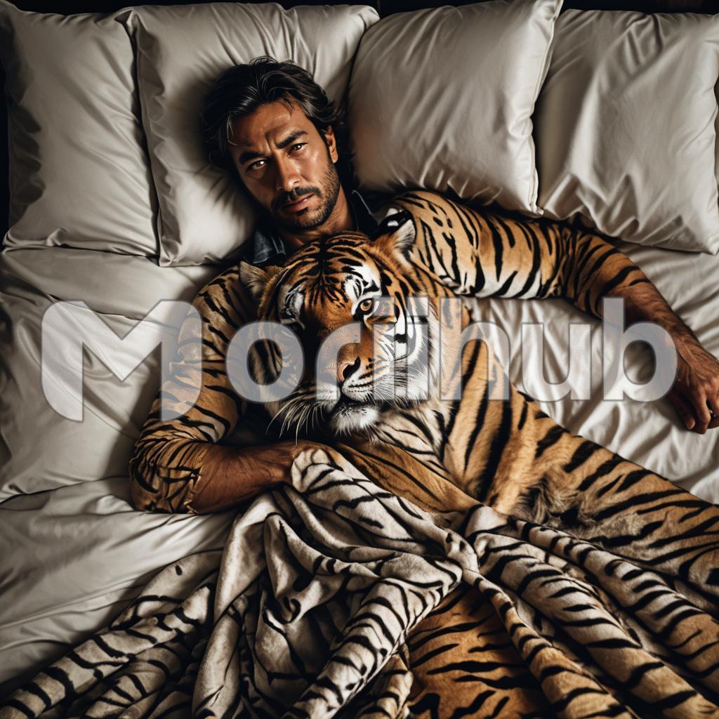 A man lying in bed dressed in a tiger skin costume presents an unusual and intriguing image. The bold stripes of the costume contrast sharply with the soft, neutral tones of the bedding, creating a striking visual effect. The faux fur material, while intended to mimic the wild and powerful appearance of a tiger, takes on a different character in the cozy, intimate setting of a bedroom. His relaxed posture contrasts with the fierce nature of the tiger, adding a layer of irony to the scene. This juxtaposition can evoke a range of emotions, from amusement to curiosity, as it blends elements of the wild with the comfort and security of home.