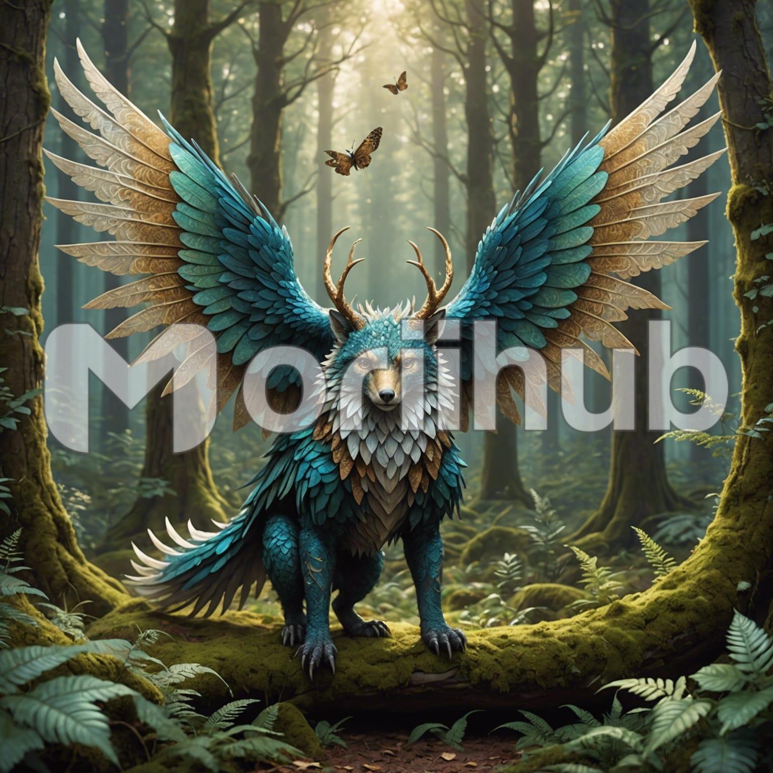 In the depths of the woods, a majestic fantasy creature stands, covered in iridescent feathers that shimmer with every movement. Its powerful wings are spread wide, revealing intricate patterns that blend with the surrounding foliage. Atop its head, two elegant horns curve gracefully, adding an air of mystique to its otherworldly presence. The creature’s eyes, bright and intelligent, scan the forest with a mix of curiosity and vigilance. This ethereal being embodies the enchanting and mysterious essence of the woodland realm, a guardian of its ancient secrets and untold wonders.