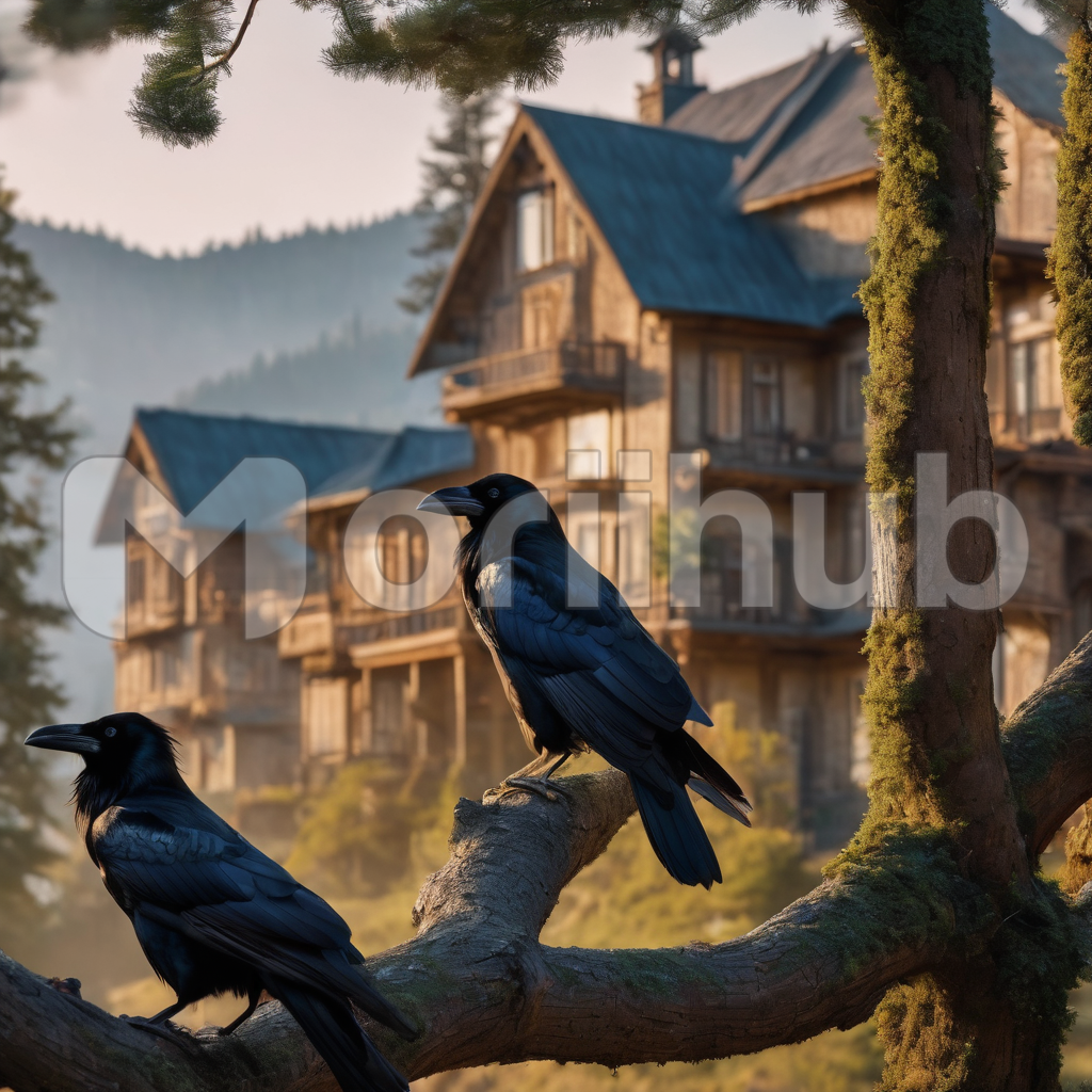 Perched on a solitary tree branch, two ravens command attention with ebony plumage against the canvas of the sky. Their onyx eyes survey the surroundings, exuding an air of mysterious intelligence. In the distance, a house stands as a silent observer, a witness to the avian tableau. The scene unfolds in monochromatic elegance, where the stoic tree branch becomes a stage for the enigmatic presence of ravens, framed by the distant silhouette of a dwelling.