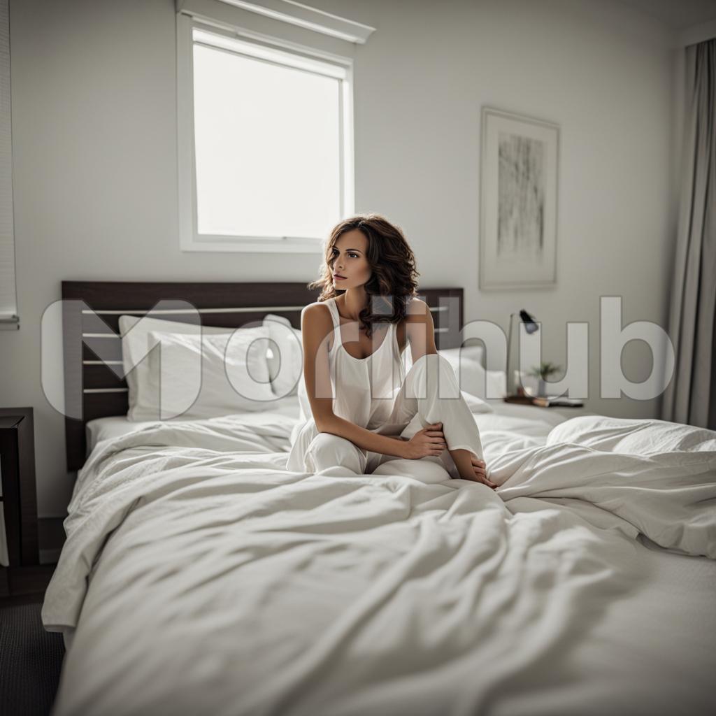 In the soft glow of a sunlit room, a beautiful woman sits on her bed, surrounded by pristine white sheets. Her hair cascades over one shoulder in effortless waves, framing an alluring profile. With an air of contemplation, she gazes to the side, capturing a moment of serene beauty. The room becomes a canvas, and her presence, a timeless portrait of grace, evoking a tranquil atmosphere in the delicate interplay of light, shadow, and feminine allure.