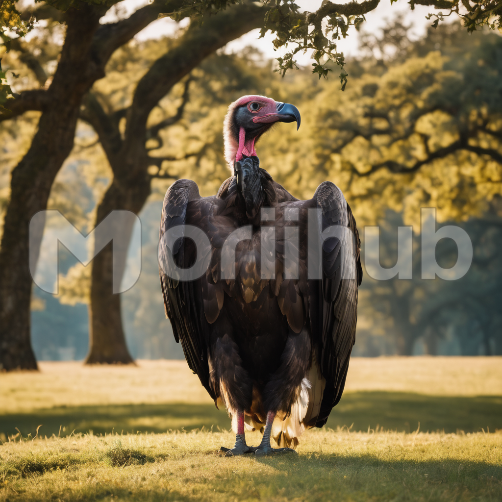 In the desolate landscape, a solitary vulture reigns atop its chosen perch, surveying the expanse below with keen eyes. Its dark silhouette contrasts starkly against the muted earth tones of the field, its wings folded neatly as it waits patiently. Surrounding trees serve as silent sentinels, their branches reaching towards the sky like skeletal fingers. Amidst this scene of eerie stillness, the vulture embodies a sense of foreboding presence, a harbinger of nature’s relentless cycle.