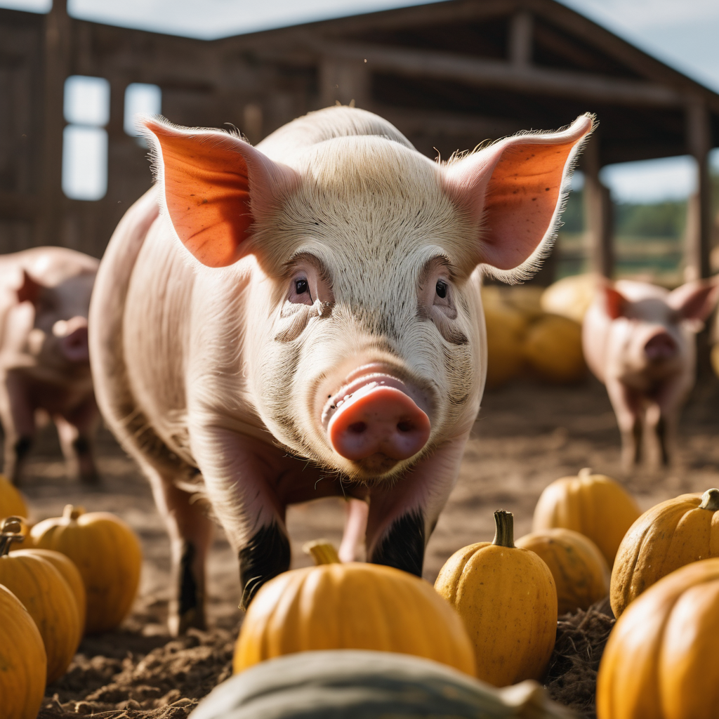Amidst the pastoral splendor of a farm, a jovial pig revels in the abundance of vibrant squash spread before it. The golden-hued vegetables, ripe for the picking, form a tantalizing display. The pig, embodying the essence of contentment, stands in a tableau of rural charm, surrounded by the promise of a hearty feast. The scene captures the wholesome allure of farm life, where simplicity and abundance coalesce in a delightful symphony of nature’s bounty.