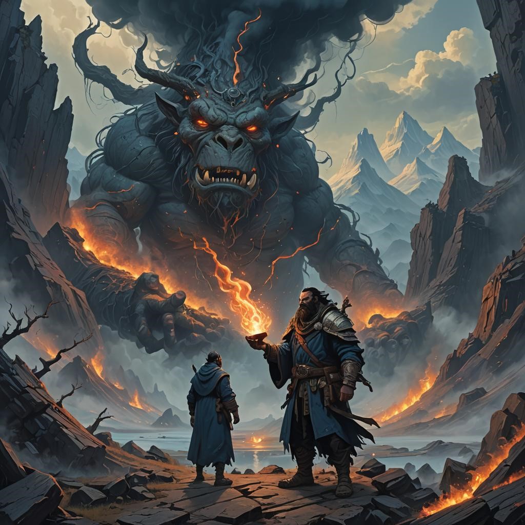 An epic scene of two warriors confronting a massive, fiery demon in a mountainous landscape. The demon, towering over the landscape, has a fearsome appearance with glowing, fiery orange eyes and molten lava dripping from its open maw. Its skin is a dark, smoky black, swirling with clouds of smoke that seem to emanate from its very being. The demon’s massive, muscular arms stretch out towards the two warriors, as if attempting to grasp them or unleash its destructive power.