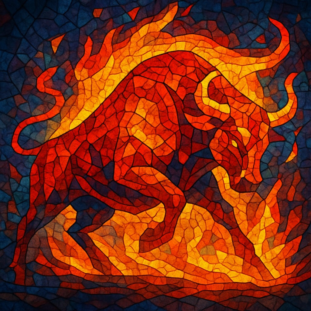 This image is a digital abstract mosaic in the shape of a powerful bull, visually composed of geometric shapes like small squares and angular pieces, mimicking a stained-glass effect. The bull is infused with the element of fire—its body is ablaze in vivid reds, oranges, and yellows, giving the illusion that it’s forged from flames.