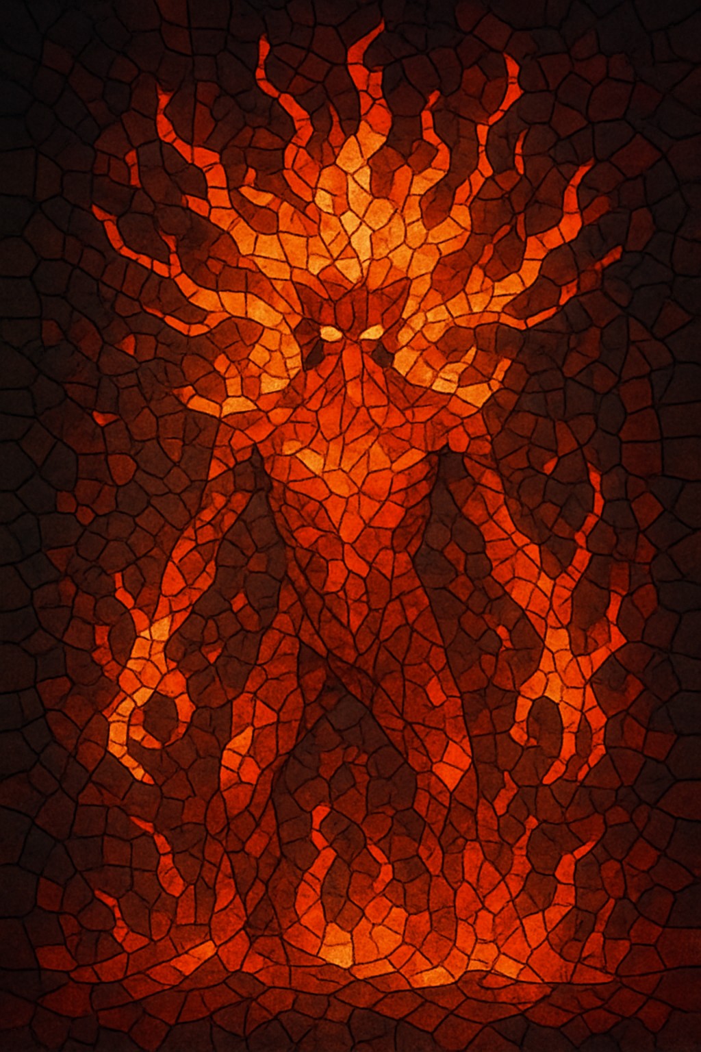 This image features a digital abstract mosaic crafted in the form of an ent (a tree-like creature), infused with the element of fire. The entire composition is rendered in a stained-glass style, using tessellated polygonal patterns. The ent’s body and limbs are composed of fiery reds, oranges, and golds, with flame-like branches radiating from its head and arms, giving it a powerful, elemental presence.