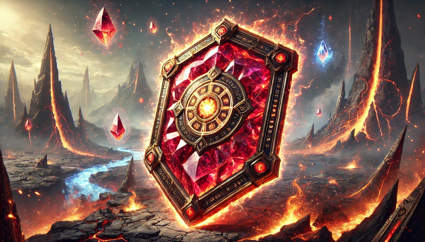 The Crystal Shield of Eternal Flame is a legendary artifact, forged from a single slab of radiant ruby-red crystal. Its surface gleams with an unnatural glow, as veins of molten lava pulse through its jagged form, shifting like liquid fire trapped within solid stone. The edges flicker with ethereal flames, casting embers into the air as though the shield itself breathes with burning intensity.