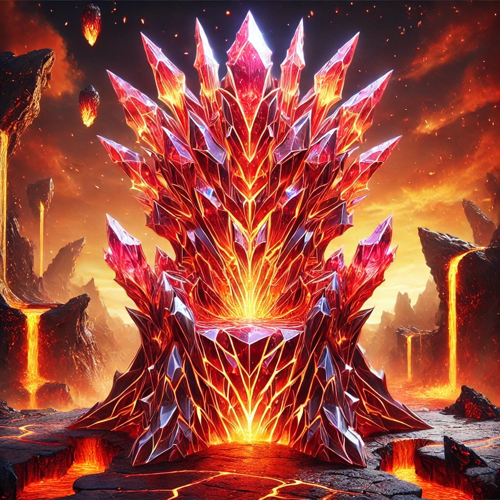 A majestic throne crafted entirely from translucent crimson and amber crystal, radiating the intense energy of the fire element. Lava-like veins of molten light flow through the throne’s body, glowing with deep oranges and fiery reds. The high backrest and towering armrests are adorned with sharp, jagged flame-shaped edges, resembling blazing fire frozen in crystal form.