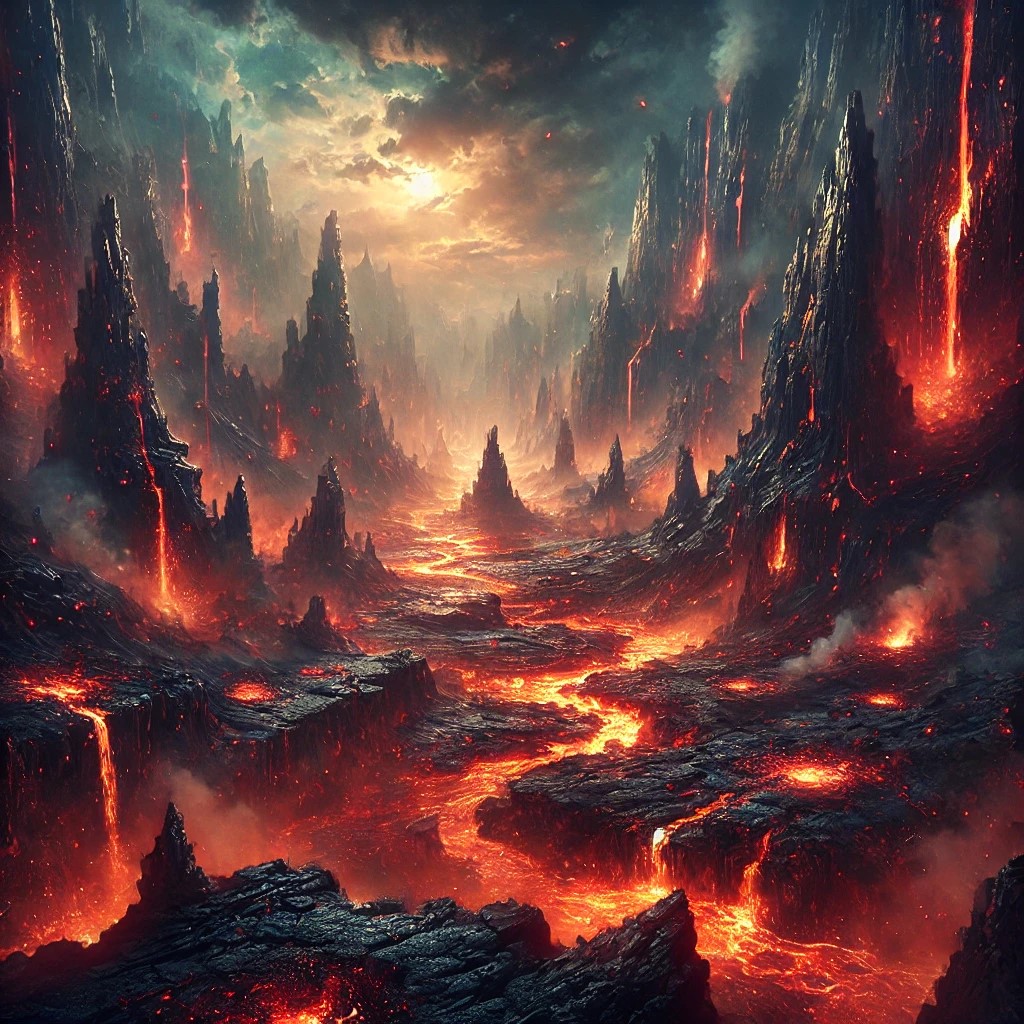 A vast valley surrounded by towering cliffs of dark, jagged rock, with rivers of molten lava winding through the landscape. The ground is scorched and cracked, with fiery cracks that emit a glowing orange-red light. Geysers of flame shoot up from the earth, and the air is thick with smoke and ash, creating a hazy, ominous atmosphere. The cliffs are dotted with glowing embers and patches of molten rock, giving the entire valley a molten, volcanic appearance.