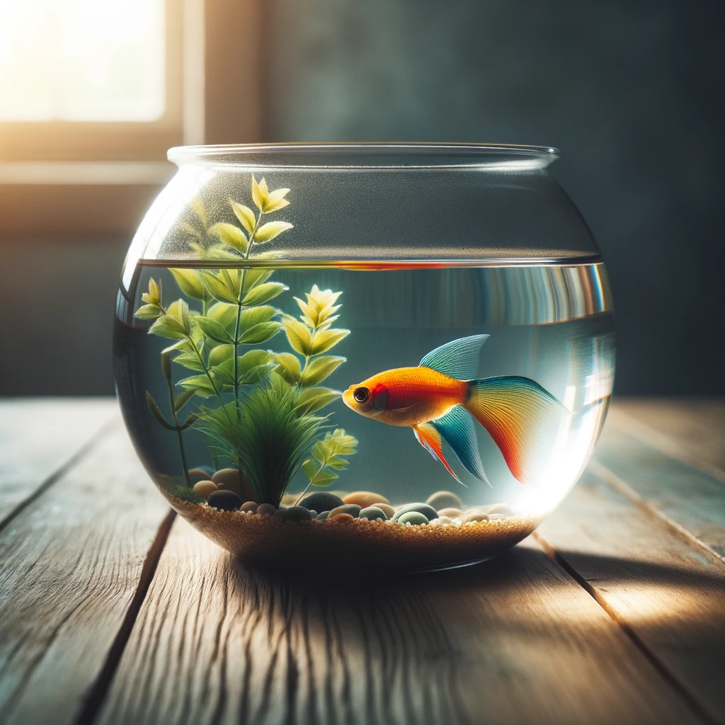 On a rustic wooden table, a clear glass bowl takes center stage, cradling a world of aquatic beauty within. A vibrant fish, resplendent in hues of orange, yellow, and blue, gracefully navigates the crystal-clear water. Its scales glisten like living jewels, as it glides through its watery sanctuary, an embodiment of nature’s artistry and grace. The table setting is a delightful fusion of organic simplicity and the mesmerizing allure of aquatic life, captivating all who behold this miniature aquatic wonderland.