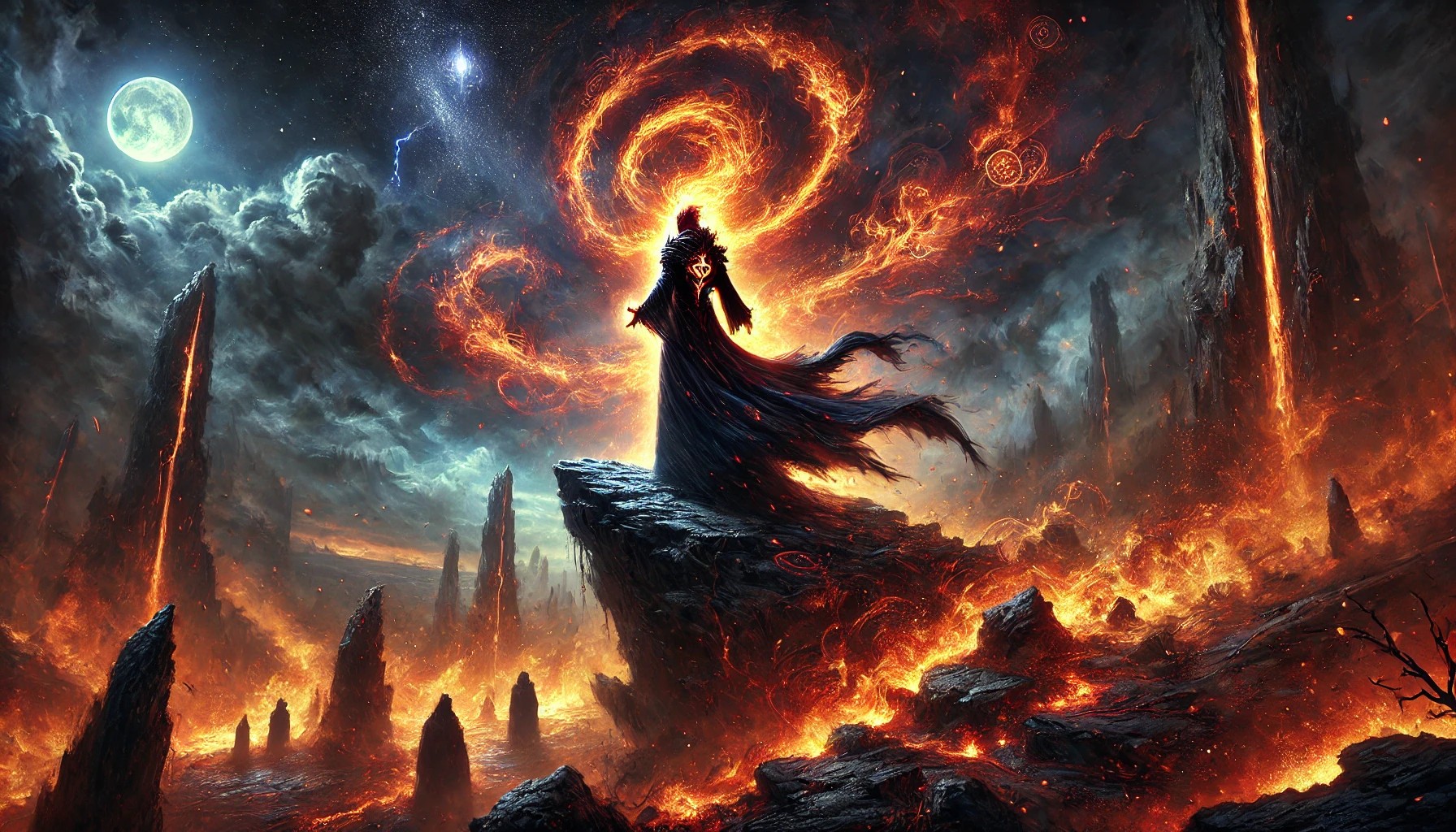 The image showcases a powerful fire mage standing atop a jagged rocky cliff, their dark, flowing robe adorned with glowing ember-like runes. Their eyes blaze with supernatural energy as they summon a massive vortex of flames that spirals into the night sky. The battlefield below is a scorched wasteland of molten lava and charred earth, with shadowy figures retreating in fear of the mage’s wrath.