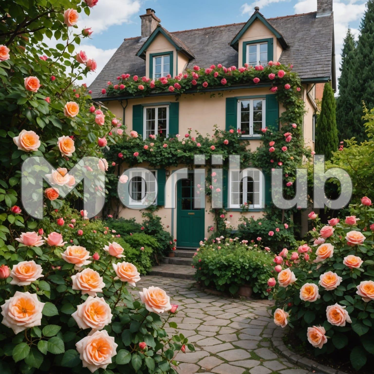 A charming house stands ahead, its inviting façade framed by a pathway lined with rose flowers and lush plants. The roses, with their delicate petals, create a welcoming atmosphere as they bloom vibrantly along the walkway. The greenery surrounding the path adds to the natural beauty, guiding the eye toward the house. The combination of the flourishing roses and plants softens the approach, making the home feel warm and inviting. This picturesque scene blends nature and architecture seamlessly, offering a sense of tranquility and comfort as one approaches the entrance.