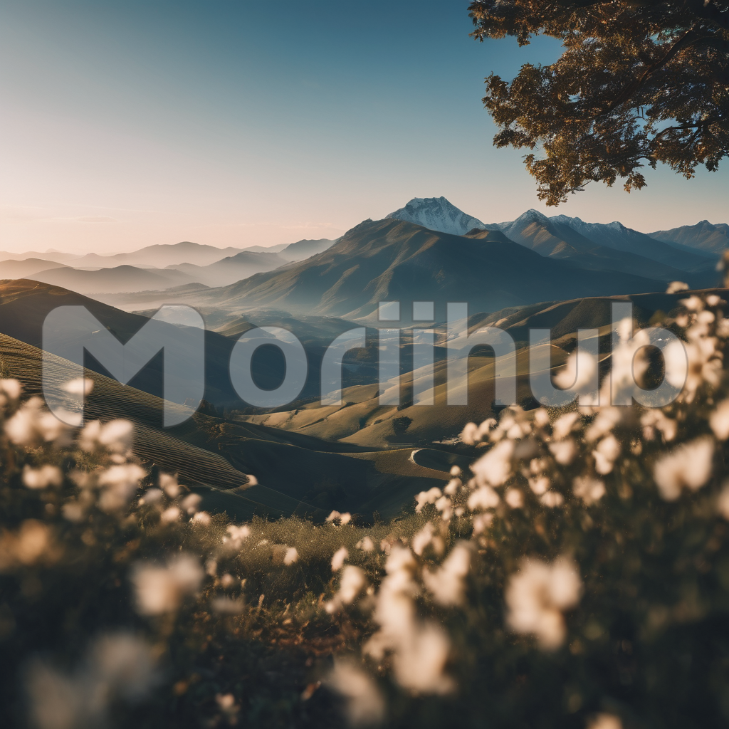 In the distance, majestic mountains rise like sentinels against the sky, their peaks cloaked in mist and mystery. Before them stretches a vast expanse of floral fields, a carpet of colors beneath the azure heavens. Vibrant blooms sway gently in the breeze, painting the landscape with hues of pink, purple, and gold. The juxtaposition of rugged peaks and delicate flowers creates a scene of breathtaking beauty, a harmonious blend of strength and serenity.