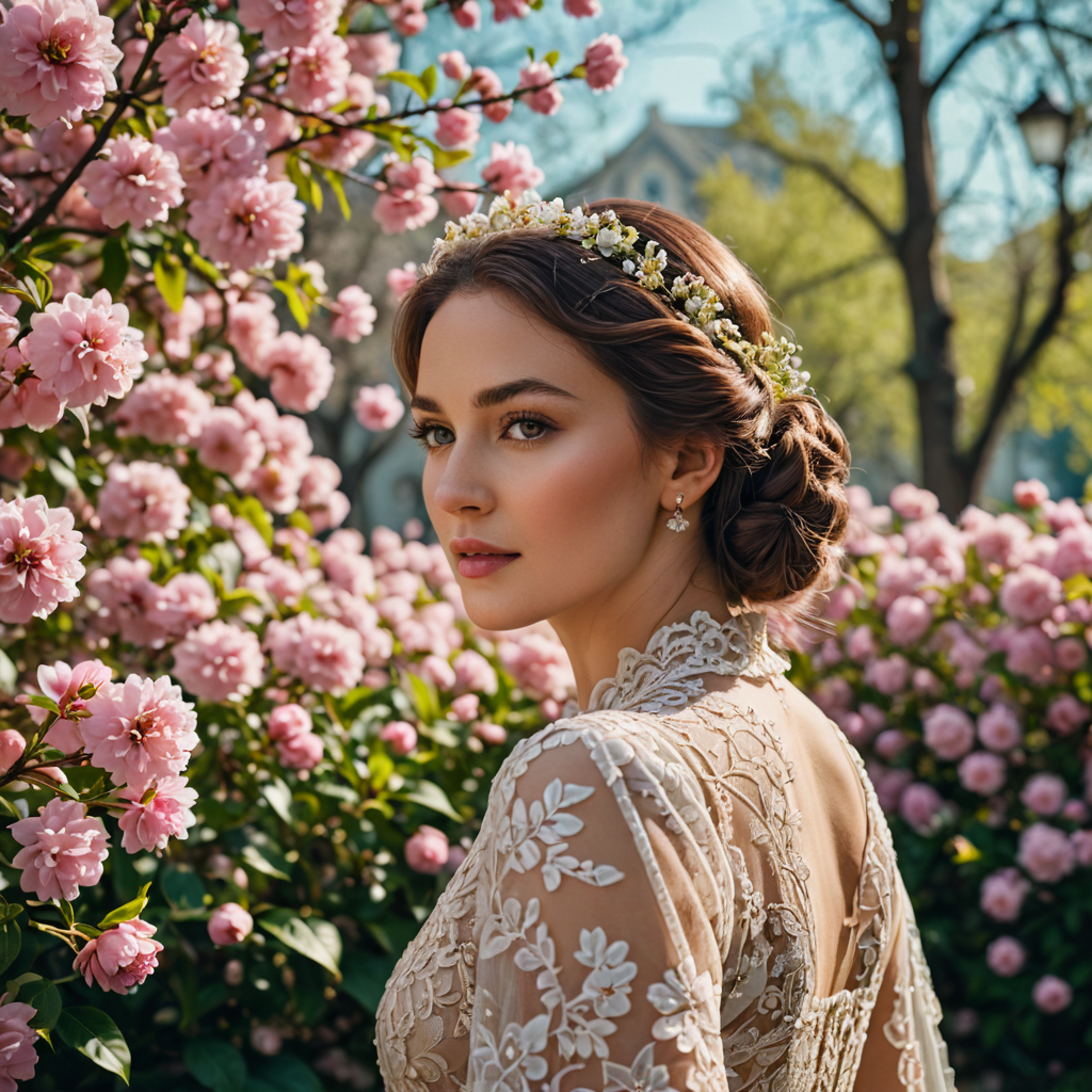 In the garden’s serenity, a woman stands, her head tilted gracefully over her back, adorned with a floral laurel. With eyes closed, she savors the whispers of the breeze, as if listening to nature’s secrets. Surrounding her, the garden blooms in vibrant hues, echoing the colors of her adornment. In this tranquil moment, she becomes one with the natural world, her presence a poetic reflection of the beauty that surrounds her.