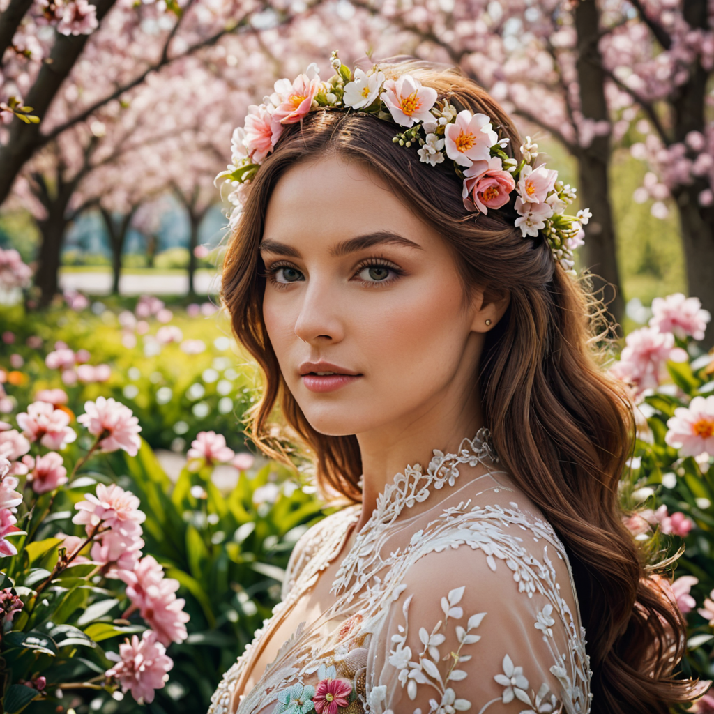 In the garden’s tranquil embrace, a beautiful woman exudes a captivating aura, her hair adorned with a delicate flower laurel. Amidst vibrant blooms and verdant foliage, she stands as a vision of natural beauty, her presence harmonizing with the serene surroundings. With grace and elegance, she embodies the essence of the garden, a radiant bloom among the blossoms, evoking a sense of timeless enchantment and tranquil serenity.