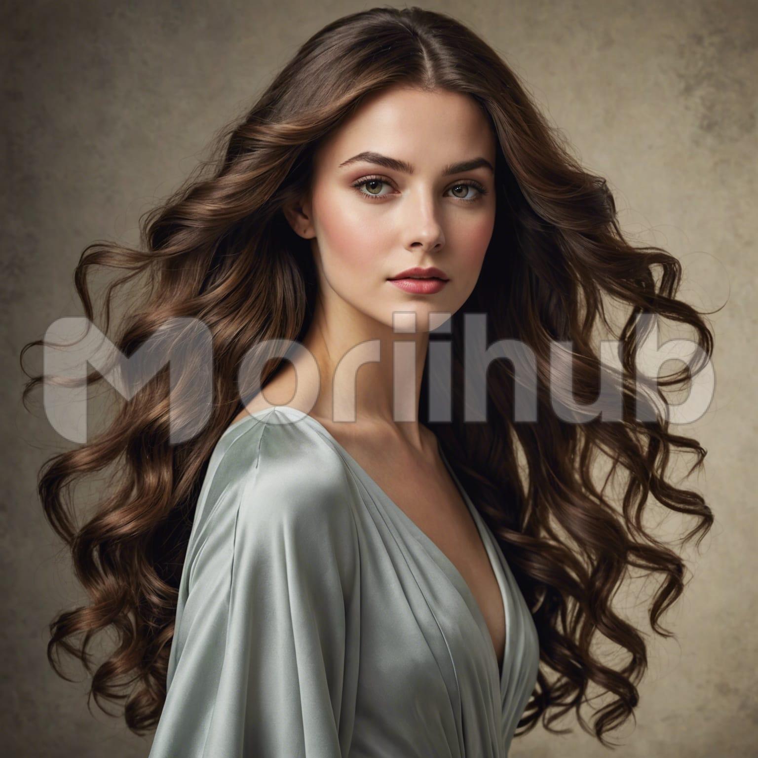 A stunning woman gazes ahead, her expression serene and captivating. Her hair flows gracefully around her, cascading in soft waves that frame her face with natural elegance. The simplicity of the plain background accentuates her striking features, drawing attention to her deep, expressive eyes and flawless complexion. Her poise exudes confidence and grace, embodying a timeless beauty that captivates the viewer. In this minimalist setting, every detail of her presence stands out, making her the undeniable focal point of the scene.