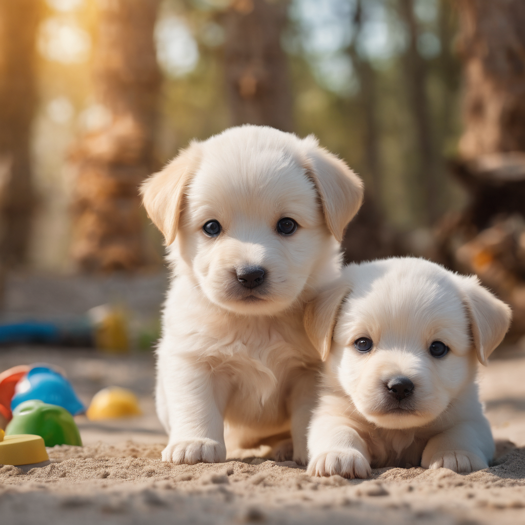 A trio of white, adorable puppies engage in a playful ballet of joy, their fur resembling fluffy clouds in motion. Tiny paws patter with boundless energy, chasing each other in gleeful circles. Their wagging tails create a symphony of happiness, and their innocent eyes sparkle with the pure delight of puppyhood.