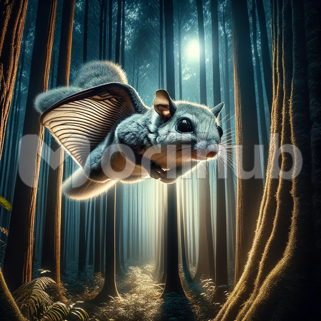 In this captivating image, a flying squirrel gracefully glides through a moonlit forest, suspended between two towering trees. Its soft, grey fur glistens in the ethereal glow, and its wide membrane of skin stretches, allowing it to navigate the night with unparalleled grace. The forest, cloaked in shadows, serves as a mystical backdrop to this nocturnal marvel, highlighting the squirrel’s ability to find beauty and freedom in the darkness.