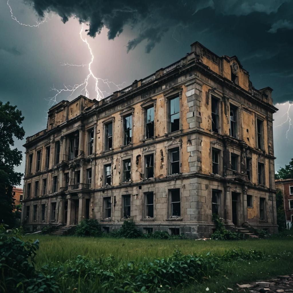 Beneath stormy clouds, an old apartment building stands, its weathered walls and worn-out windows telling tales of neglect. Short grass carpets the lawn, a patchwork of green amidst the urban decay. Lightning pierces the darkness, casting eerie shadows across the scene. In this desolate setting, the clash of elements mirrors the building’s own battle against time and neglect, each flash of lightning illuminating its silent struggle against the relentless march of decay.