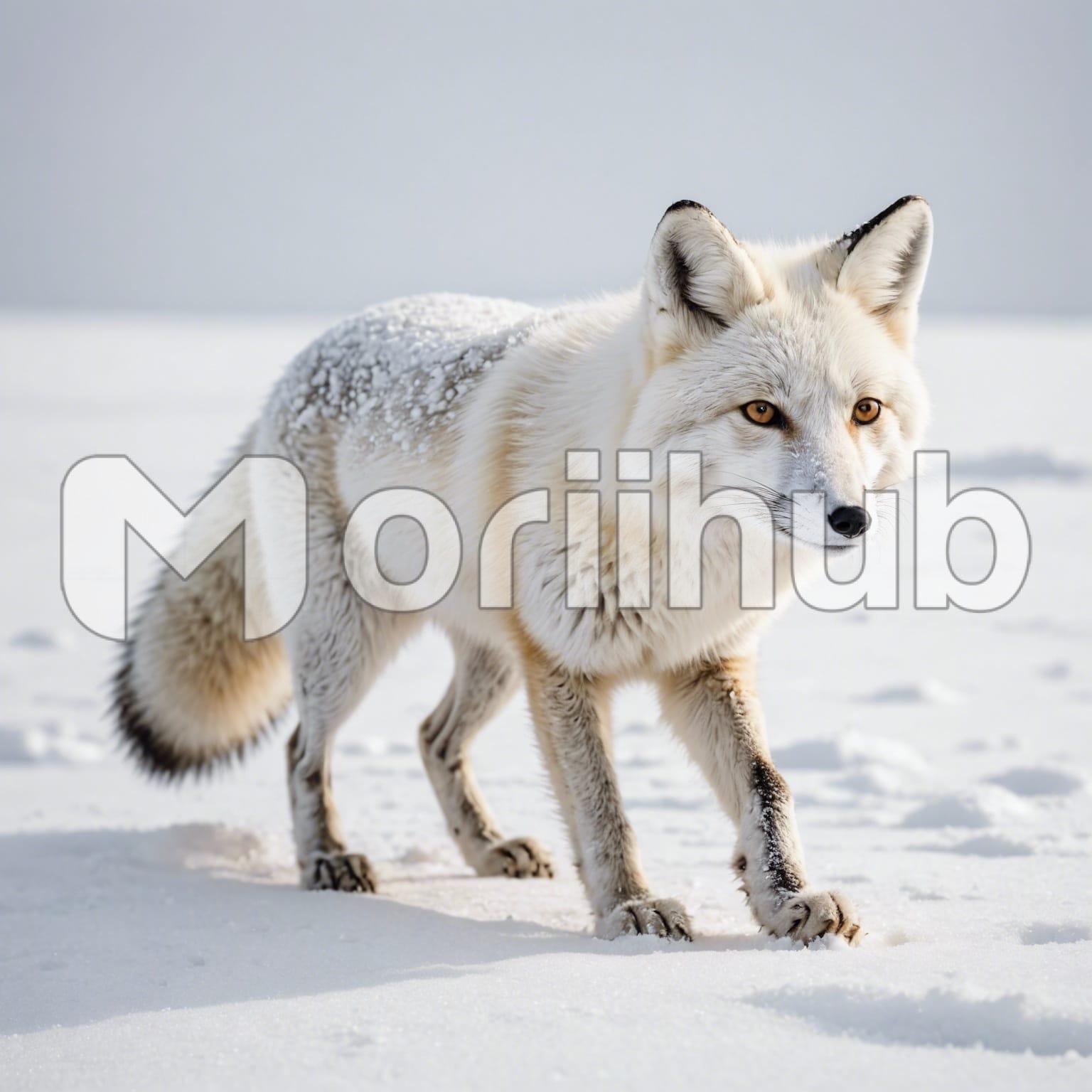 In a tranquil snowscape, a fox treads lightly, its white fur blending seamlessly with the blanket of snow. Each step is deliberate, leaving precise, delicate paw prints in the snow. Its bushy tail sways gently, providing balance as it navigates the frozen terrain. The fox’s keen eyes scan the surroundings, alert and curious, reflecting the shimmering winter landscape. The air is crisp and silent, save for the soft crunch of snow beneath its paws. This scene captures the fox’s blend of grace and agility, a solitary figure in a serene, wintry world.