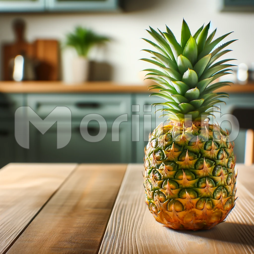 On a rustic wooden kitchen table, a fresh, ripe pineapple takes center stage. Its vibrant green crown stands tall, a symbol of its vitality. The pineapple’s golden-yellow body boasts a rough, diamond-patterned texture, glistening with droplets of natural sweetness. This tropical fruit embodies the essence of freshness, inviting the promise of a delicious, sun-kissed treat.