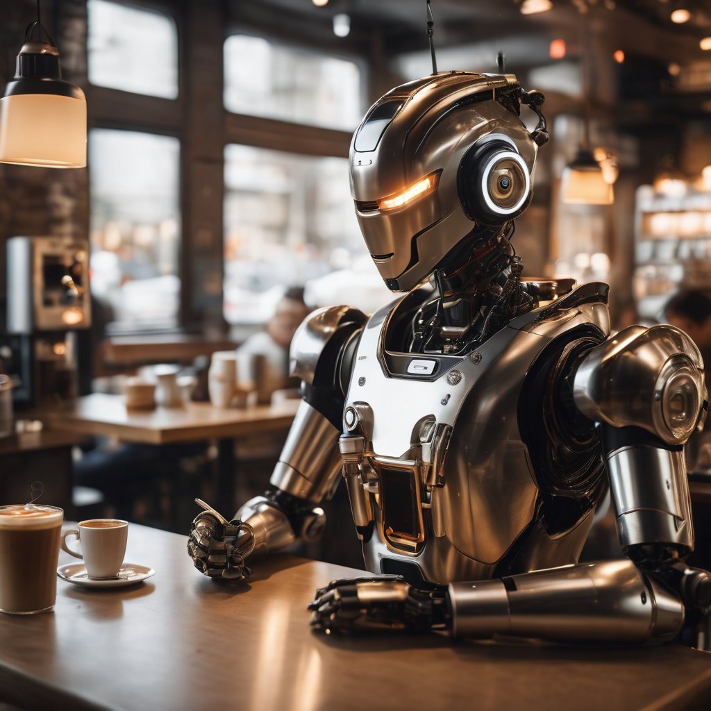 In the futuristic café, a marvel of technology takes center stage as a robot expertly brews coffee. With sleek design and precision, it navigates the cafe, creating a symphony of whirs and hisses. The aroma of freshly ground beans fills the air, blending the nostalgia of tradition with the innovation of tomorrow, offering patrons a unique blend of past and future in every cup.