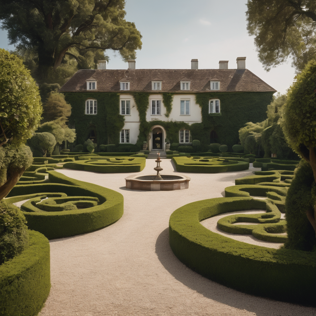 Amidst a picturesque landscape, a stunning house stands as a beacon of elegance. Its grand facade boasts meticulous craftsmanship and graceful architectural details, framed by lush greenery. In the forefront, intricately shaped topiaries add a touch of whimsy and refinement to the scene, enhancing the house’s charm. Bathed in soft sunlight, it exudes an aura of timeless beauty and sophistication, captivating all who behold its graceful presence.