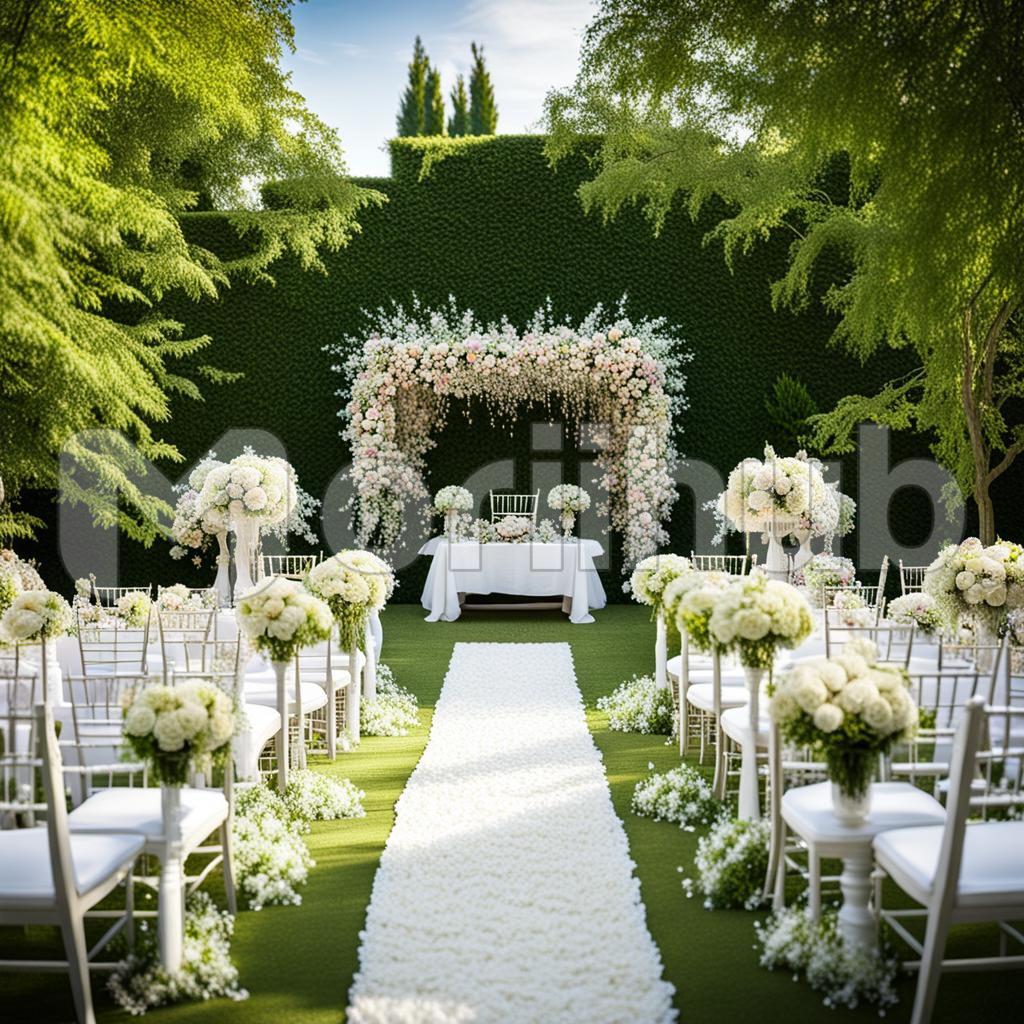 In this meticulously arranged garden for a wedding, nature becomes a silent witness to romantic dreams. Lush blooms unfurl in carefully curated beds, a vibrant tapestry of colors and fragrances. Graceful archways adorned with ivy create enchanting pathways, leading towards a focal point where a ceremonial altar stands, adorned with delicate florals. The absence of people leaves room for anticipation, and the garden becomes a tranquil haven, a prelude to the love story soon to be written amid its blossoming splendor.