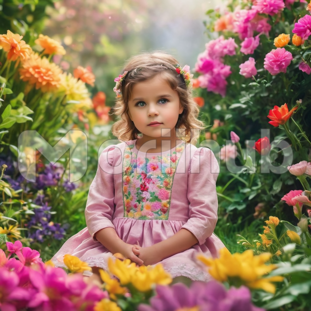 In the heart of a blooming garden, a young girl sits gracefully, her gown a symphony of petals and lace. She embodies the garden’s enchantment, her presence a delicate bloom among the vibrant flora. With every movement, her gown rustles like wind through flower beds, while her gaze, alight with wonder, dances among the blossoms. Amidst nature’s embrace, she is a vision of innocence and elegance, a living embodiment of the garden’s timeless allure.