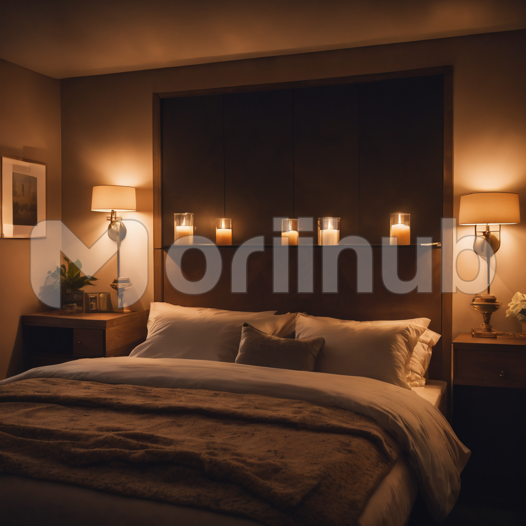 In the softly lit bedroom, a tranquil ambiance prevails. Lamps on either side of the bed cast a warm, gentle glow, illuminating the room with a soothing radiance. At the head of the bed, scented candles flicker, filling the air with fragrant whispers of tranquility. Shadows dance upon the walls, and the cozy atmosphere embraces the space, creating a haven of calm and relaxation within the dimly lit bedroom.
